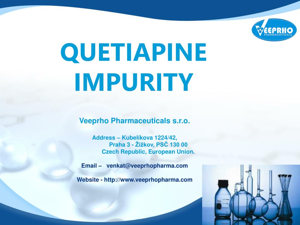 Quetiapine Impurity We are manufacturer and supplier of all Quetiapine impurities which is to be isolated by preparative HPLC and Lyophillized. Veeprho Pharmaceuticals s.r.o. is the manufacturer and supplier of certified impurity of Quetiapine. Veeprho Pharmaceuticals s.r.o. is the manufacturer and supplier of all Quetiapine Impurity which are acceptable to all regulatory agencies in the world, US-FDA, MHRA, MCC, WHO, Brazil, Japan.