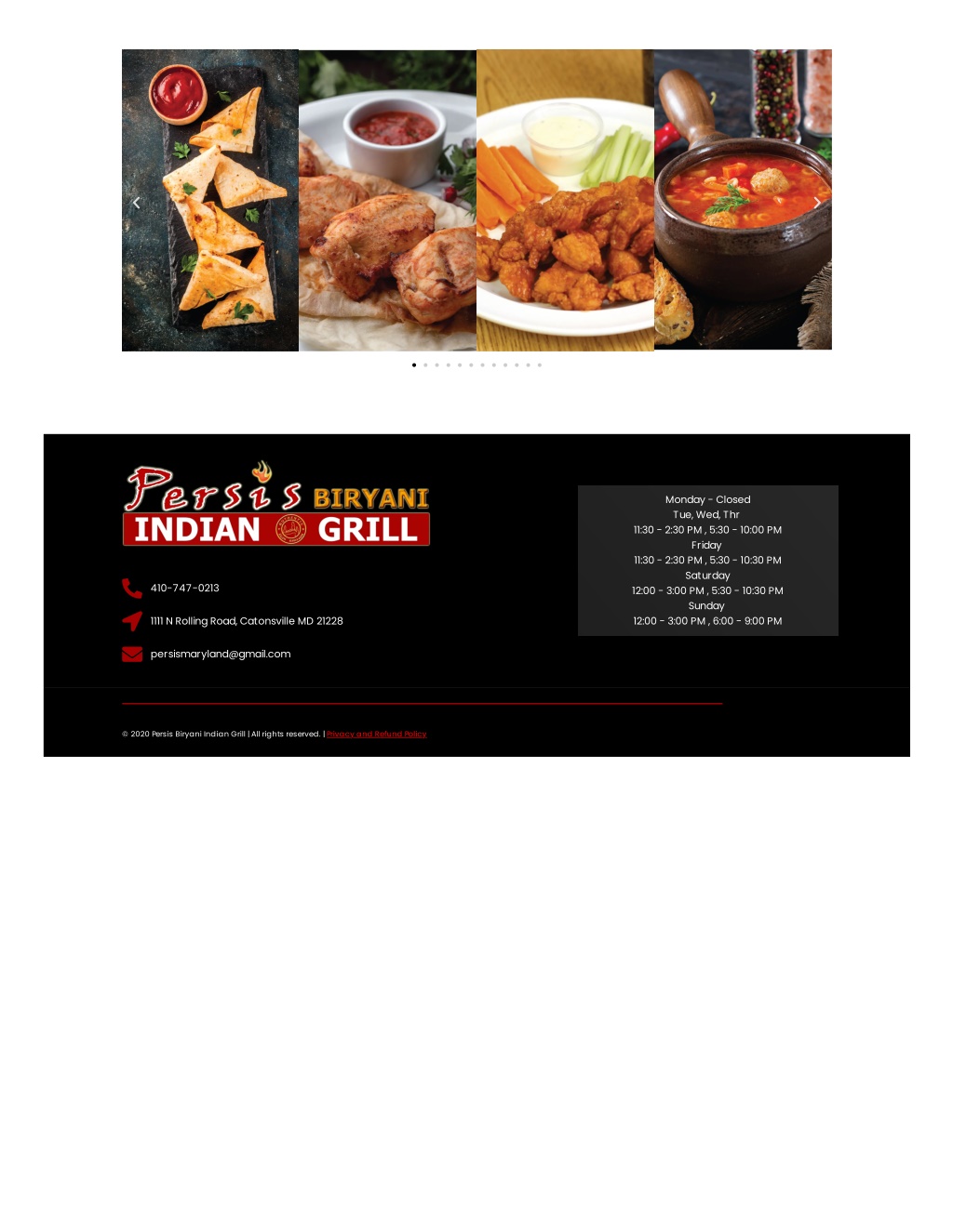 Monday - Closed Tue, Wed, Thr 11:30 - 2:30 PM , 5:30 - 10:00 PM Friday 11:30 - 2:30 PM , 5:30 - 10:30 PM Saturday 12:00 - 3:00 PM , 5:30 - 10:30 PM Sunday 12:00 - 3:00 PM , 6:00 - 9:00 PM 410-747-0213 1111 N Rolling Road, Catonsville MD 21228 persismaryland@gmail.com © 2020 Persis Biryani Indian Grill | All rights reserved. | Privacy and Refund Policy