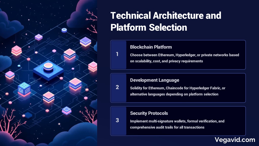 4. Technical Architecture and Platform Selection Blockchain Platform Choose between Ethereum, Hyperledger, or private networks based on scalability, cost, and privacy requirements 1 Development Language Solidity for Ethereum, Chaincode for Hyperledger Fabric, or alternative languages depending on platform selection 2 Security Protocols Implement multi-signature wallets, formal verification, and comprehensive audit trails for all transactions 3 Vegavid.com