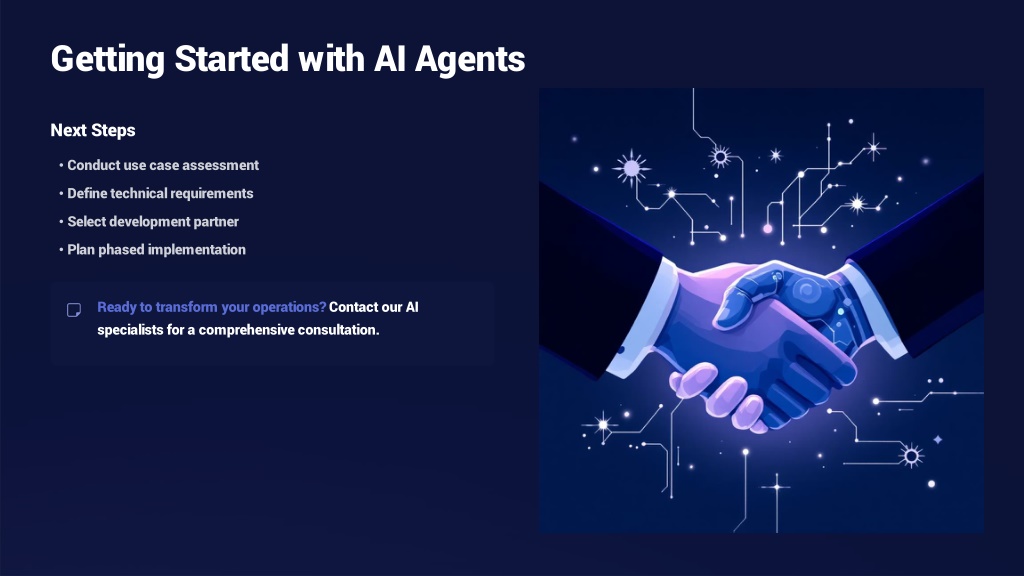 Getting Started with AI Agents Next Steps • Conduct use case assessment • Define technical requirements • Select development partner • Plan phased implementation Ready to transform your operations? Contact our AI specialists for a comprehensive consultation.