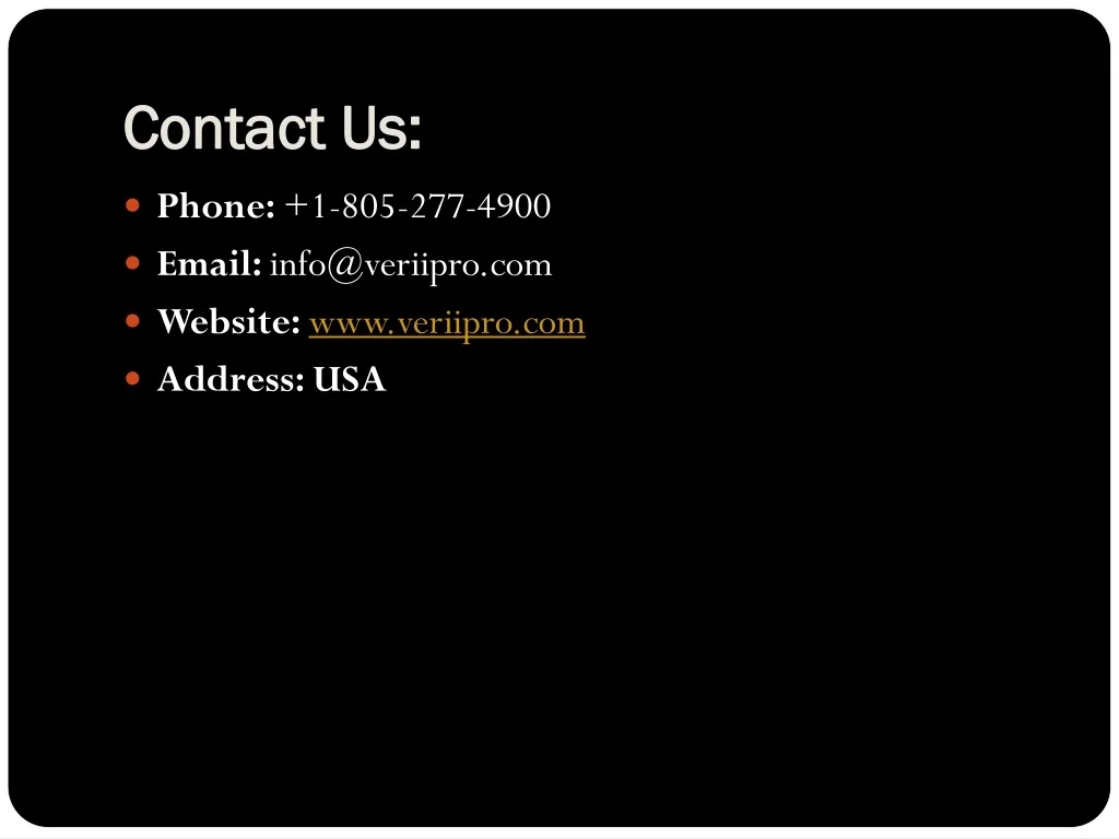 Contact Us: • Phone: +1-805-277-4900 • Email: info@veriipro.com • Website: www.veriipro.com • Address: USA