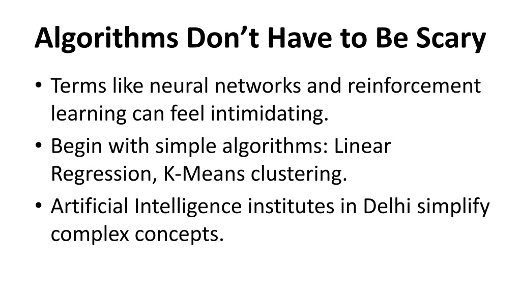 Algorithms Don’t Have to Be Scary • Terms like neural networks and reinforcement learning can feel intimidating. • Begin with simple algorithms: Linear Regression, K-Means clustering. • Artificial Intelligence institutes in Delhi simplify complex concepts.