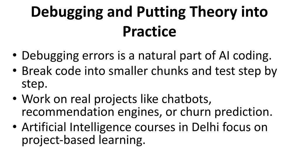 Debugging and Putting Theory into Practice • Debugging errors is a natural part of AI coding. • Break code into smaller chunks and test step by step. • Work on real projects like chatbots, recommendation engines, or churn prediction. • Artificial Intelligence courses in Delhi focus on project-based learning.