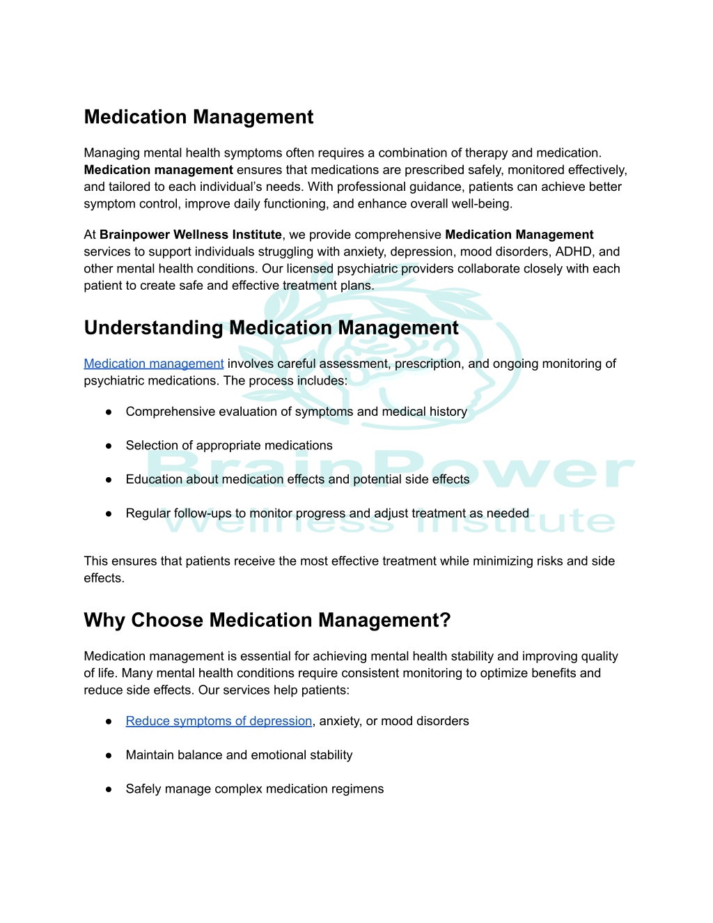2. ● Receive personalized guidance and education Our goal is to empower patients to take control of their mental health while providing compassionate, professional care. Conditions Treated Our licensed psychiatric team provides medication management for a wide range of conditions, including: ● Anxiety Disorders ● Depression and Mood Disorders ● Bipolar Disorder ● ADHD (Children, Adolescents & Adults) ● Obsessive-Compulsive Disorder (OCD) ● Sleep Disorders ● Substance Use & Dual Diagnosis Our Approach At Brainpower Wellness Institute, we prioritize safe, personalized, and evidence-based medication management. Our approach includes: ● Initial comprehensive psychiatric evaluations ● Prescription of medications tailored to individual needs ● Regular monitoring and follow-ups ● Coordination with therapy and other supportive care ● Education and support for patients and families Your Mental Health Journey Starts Here