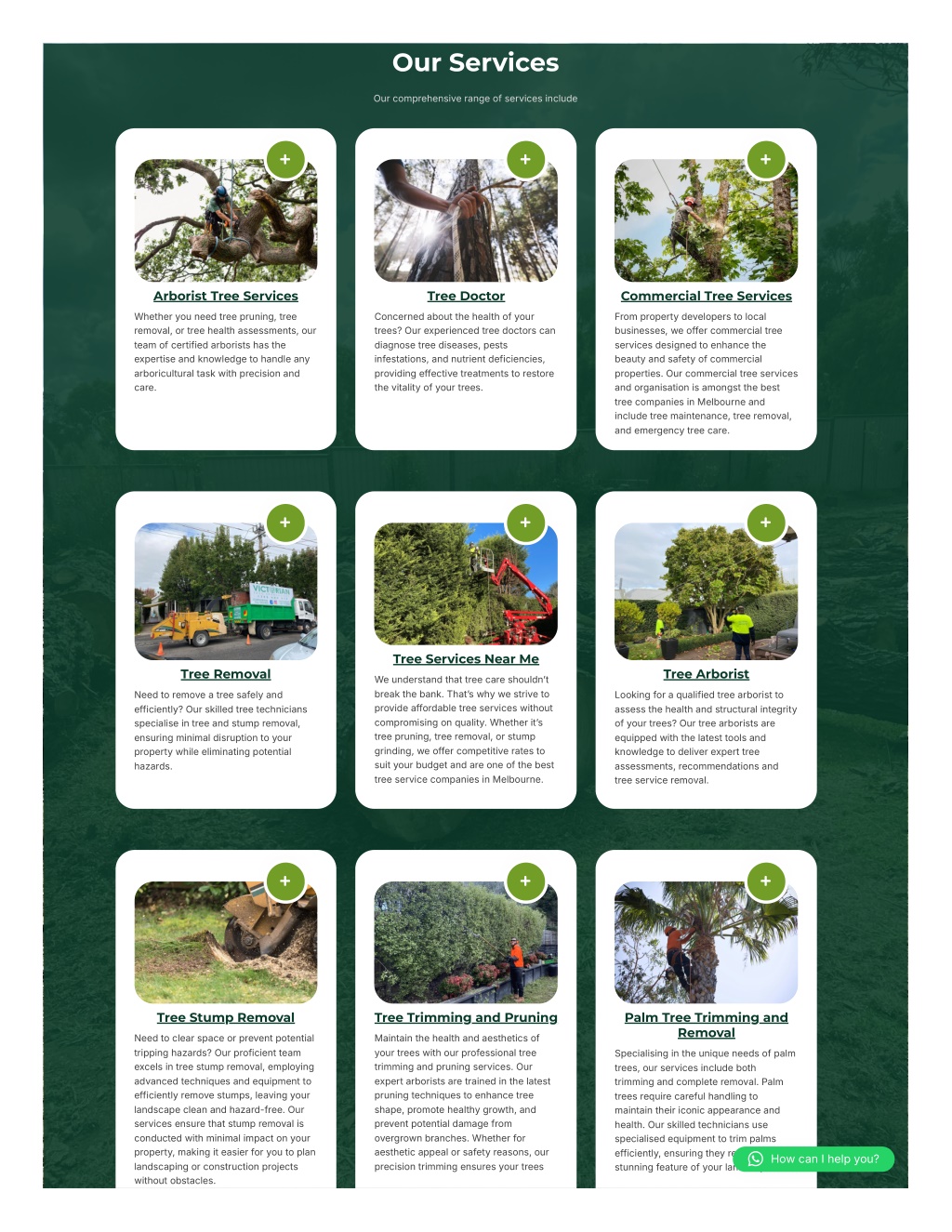 Our Services Ourcomprehensiverangeofservicesinclude Arborist Tree Services Tree Doctor Commercial Tree Services Whetheryouneedtreepruning, tree removal, ortreehealthassessments, our teamofcertifiedarboristshasthe expertiseandknowledgetohandleany arboriculturaltaskwithprecisionand care. Concernedaboutthehealthofyour trees? Ourexperiencedtreedoctorscan diagnosetreediseases, pests infestations, andnutrientdeficiencies, providingeffectivetreatmentstorestore thevitalityofyourtrees. Frompropertydeveloperstolocal businesses, weoffercommercialtree servicesdesignedtoenhancethe beautyandsafetyofcommercial properties. Ourcommercialtreeservices andorganisationisamongstthebest treecompaniesinMelbourneand includetreemaintenance, treeremoval, andemergencytreecare. Tree Services Near Me Tree Removal Tree Arborist Weunderstandthattreecareshouldnʼt breakthebank. Thatʼswhywestriveto provideaffordabletreeserviceswithout compromisingonquality. Whetheritʼs treepruning, treeremoval, orstump grinding, weoffercompetitiveratesto suityourbudgetandareoneofthebest treeservicecompaniesinMelbourne. Needtoremoveatreesafelyand efficiently? Ourskilledtreetechnicians specialiseintreeandstumpremoval, ensuringminimaldisruptiontoyour propertywhileeliminatingpotential hazards. Lookingforaqualifiedtreearboristto assessthehealthandstructuralintegrity ofyourtrees? Ourtreearboristsare equippedwiththelatesttoolsand knowledgetodeliverexperttree assessments, recommendationsand treeserviceremoval. Tree Stump Removal Tree Trimming and Pruning Palm Tree Trimming and Removal Needtoclearspaceorpreventpotential trippinghazards? Ourproficientteam excelsintreestumpremoval, employing advancedtechniquesandequipmentto efficientlyremovestumps, leavingyour landscapecleanandhazard-free. Our servicesensurethatstumpremovalis conductedwithminimalimpactonyour property, makingiteasierforyoutoplan landscapingorconstructionprojects withoutobstacles. Maintainthehealthandaestheticsof yourtreeswithourprofessionaltree trimmingandpruningservices. Our expertarboristsaretrainedinthelatest pruningtechniquestoenhancetree shape, promotehealthygrowth, and preventpotentialdamagefrom overgrownbranches. Whetherfor aestheticappealorsafetyreasons, our precisiontrimmingensuresyourtrees Specialisingintheuniqueneedsofpalm trees, ourservicesincludeboth trimmingandcompleteremoval. Palm treesrequirecarefulhandlingto maintaintheiriconicappearanceand health. Ourskilledtechniciansuse specialisedequipmenttotrimpalms efficiently, ensuringtheyremaina stunningfeatureofyourlandscape. HowcanIhelpyou?