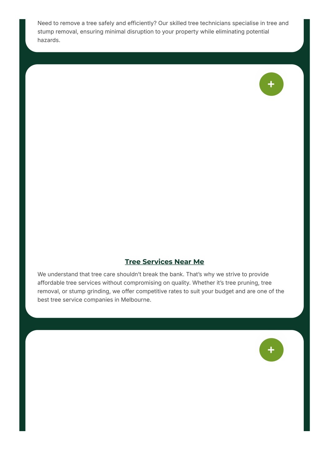 Needtoremoveatreesafelyandefficiently? Ourskilledtreetechniciansspecialiseintreeand stumpremoval, ensuringminimaldisruptiontoyourpropertywhileeliminatingpotential hazards. Tree Services Near Me Weunderstandthattreecareshouldnʼtbreakthebank. Thatʼswhywestrivetoprovide affordabletreeserviceswithoutcompromisingonquality. Whetheritʼstreepruning, tree removal, orstumpgrinding, weoffercompetitiveratestosuityourbudgetandareoneofthe besttreeservicecompaniesinMelbourne.