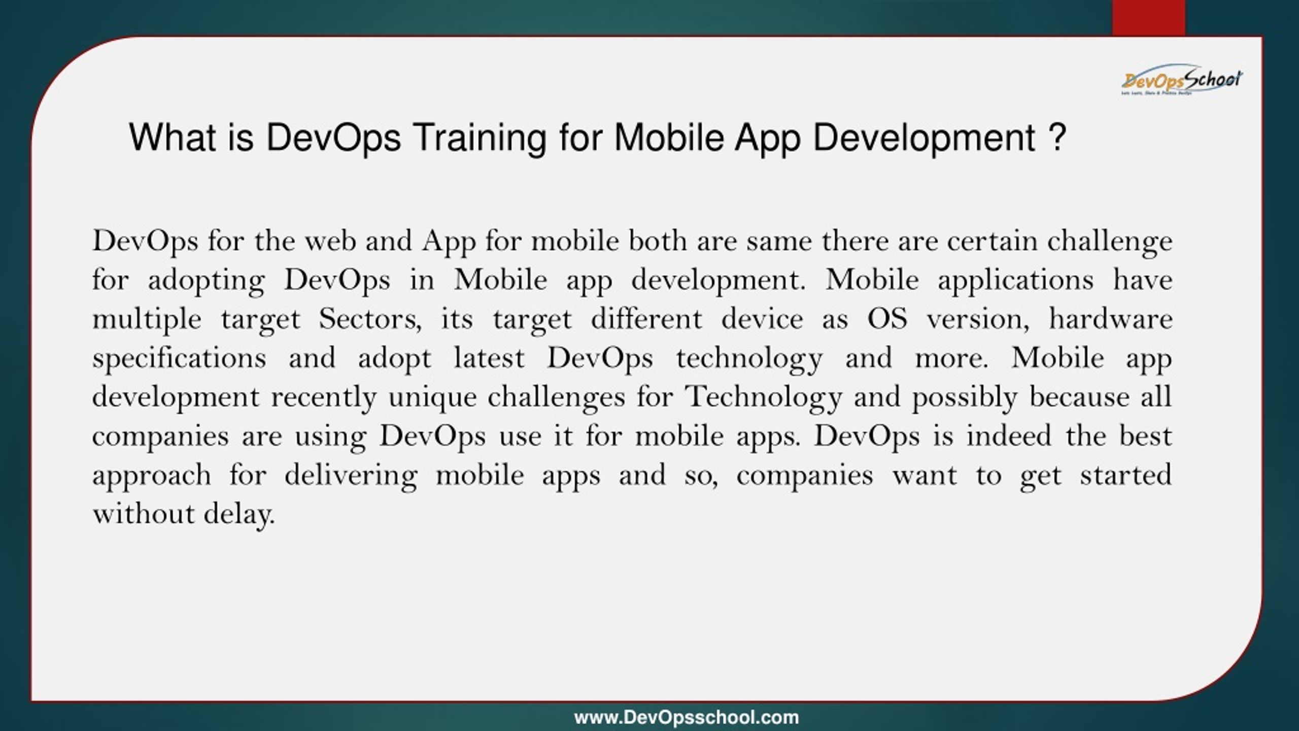 What is DevOps Training for Mobile App Development ? DevOps for the web and App for mobile both are same there are certain challenge for adopting DevOps in Mobile app development. Mobile applications have multiple target Sectors, its target different device as OS version, hardware specifications and adopt latest DevOps technology and more. Mobile app development recently unique challenges for Technology and possibly because all companies are using DevOps use it for mobile apps. DevOps is indeed the best approach for delivering mobile apps and so, companies want to get started without delay. www.DevOpsschool.com