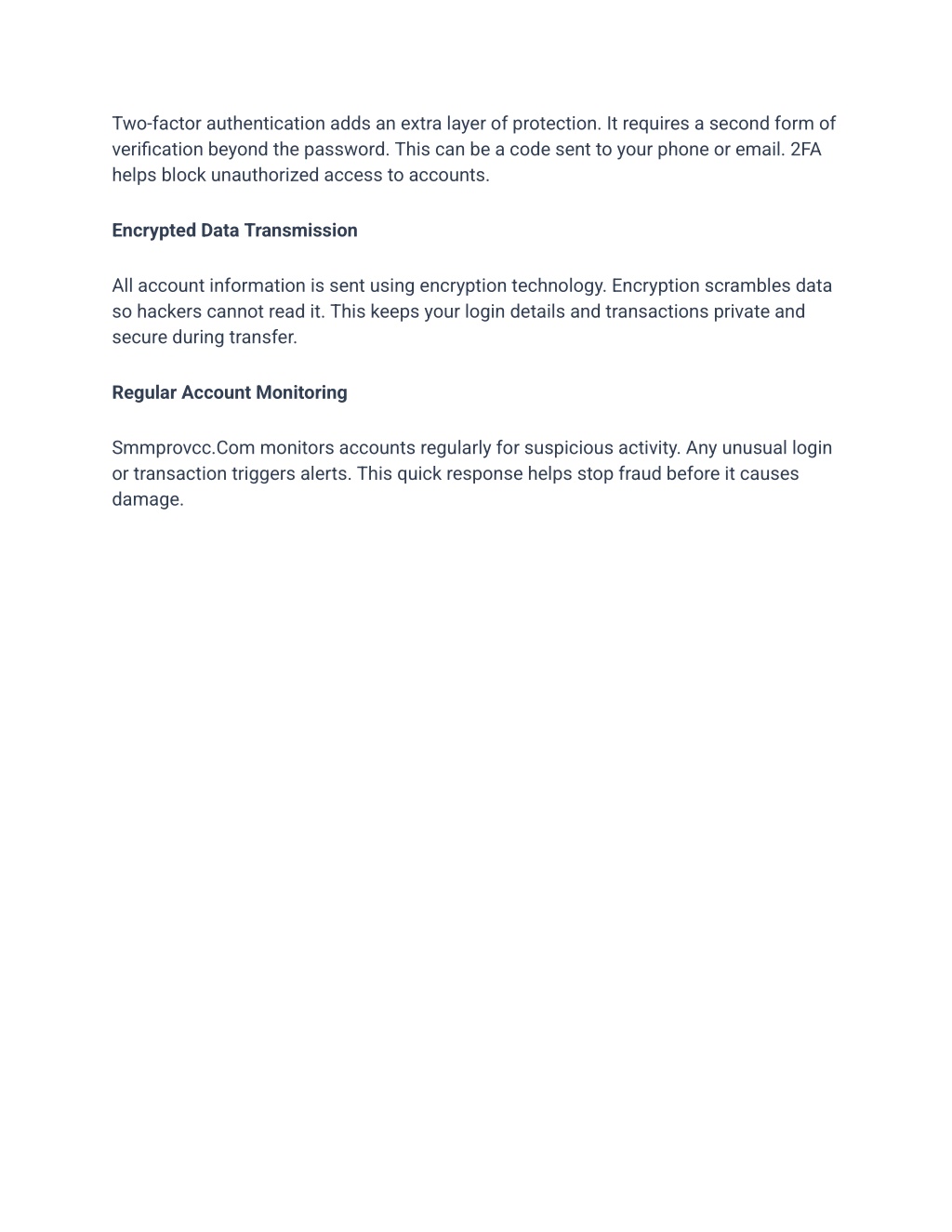 Two-factor authentication adds an extra layer of protection. It requires a second form of verification beyond the password. This can be a code sent to your phone or email. 2FA helps block unauthorized access to accounts. Encrypted Data Transmission All account information is sent using encryption technology. Encryption scrambles data so hackers cannot read it. This keeps your login details and transactions private and secure during transfer. Regular Account Monitoring Smmprovcc.Com monitors accounts regularly for suspicious activity. Any unusual login or transaction triggers alerts. This quick response helps stop fraud before it causes damage.