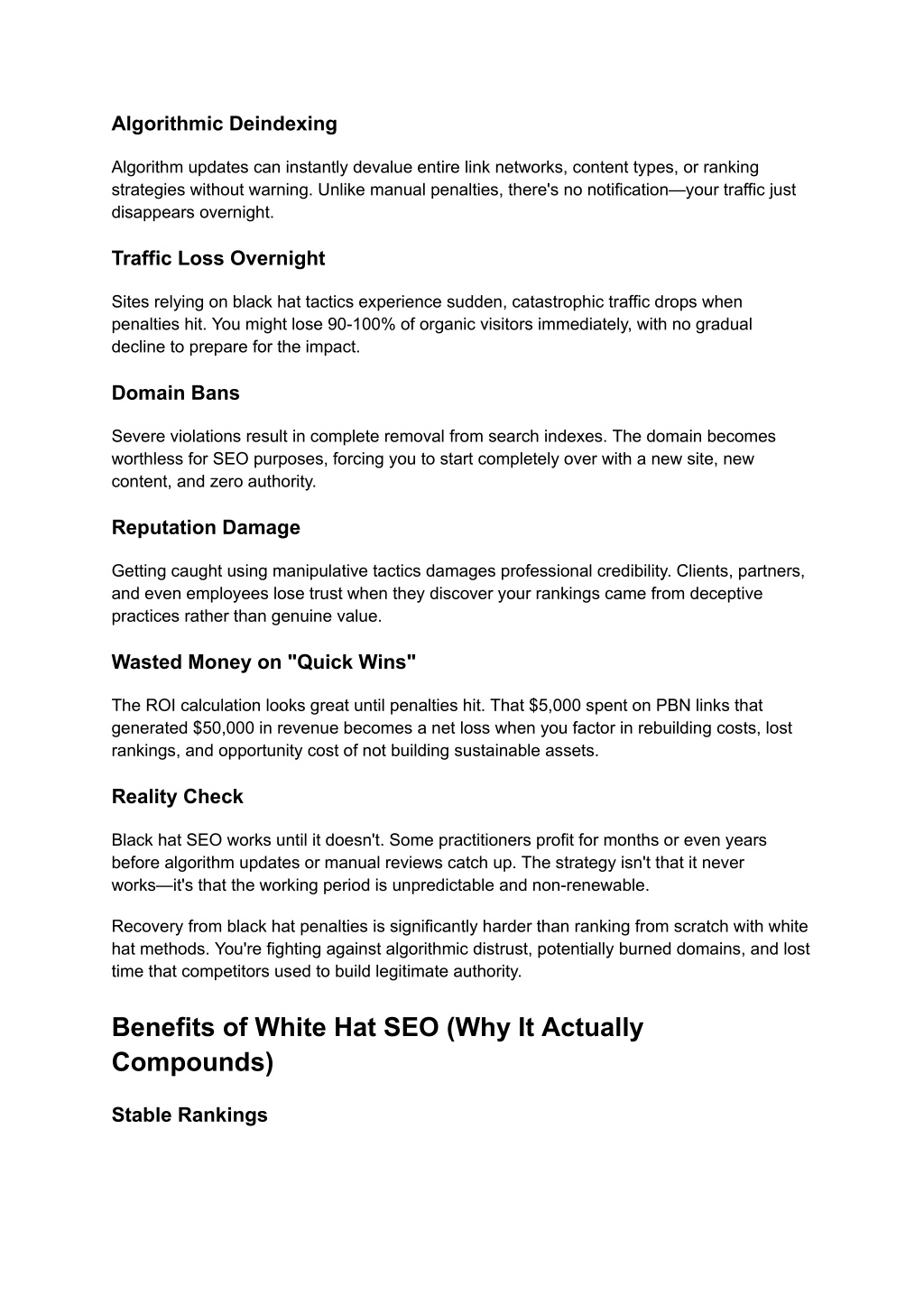 Algorithmic Deindexing Algorithm updates can instantly devalue entire link networks, content types, or ranking strategies without warning. Unlike manual penalties, there's no notification—your traffic just disappears overnight. Traffic Loss Overnight Sites relying on black hat tactics experience sudden, catastrophic traffic drops when penalties hit. You might lose 90-100% of organic visitors immediately, with no gradual decline to prepare for the impact. Domain Bans Severe violations result in complete removal from search indexes. The domain becomes worthless for SEO purposes, forcing you to start completely over with a new site, new content, and zero authority. Reputation Damage Getting caught using manipulative tactics damages professional credibility. Clients, partners, and even employees lose trust when they discover your rankings came from deceptive practices rather than genuine value. Wasted Money on "Quick Wins" The ROI calculation looks great until penalties hit. That $5,000 spent on PBN links that generated $50,000 in revenue becomes a net loss when you factor in rebuilding costs, lost rankings, and opportunity cost of not building sustainable assets. Reality Check Black hat SEO works until it doesn't. Some practitioners profit for months or even years before algorithm updates or manual reviews catch up. The strategy isn't that it never works—it's that the working period is unpredictable and non-renewable. Recovery from black hat penalties is significantly harder than ranking from scratch with white hat methods. You're fighting against algorithmic distrust, potentially burned domains, and lost time that competitors used to build legitimate authority. Benefits of White Hat SEO (Why It Actually Compounds) Stable Rankings