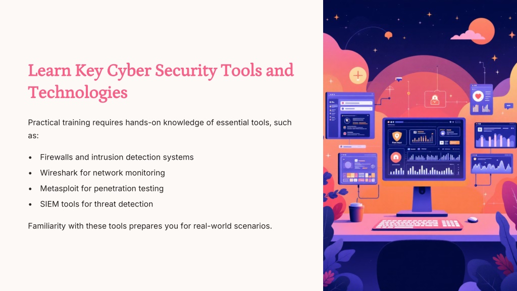 5. Learn Key Cyber Security Tools and Technologies Practical training requires hands-on knowledge of essential tools, such as: • Firewalls and intrusion detection systems • Wireshark for network monitoring • Metasploit for penetration testing • SIEM tools for threat detection Familiarity with these tools prepares you for real-world scenarios.