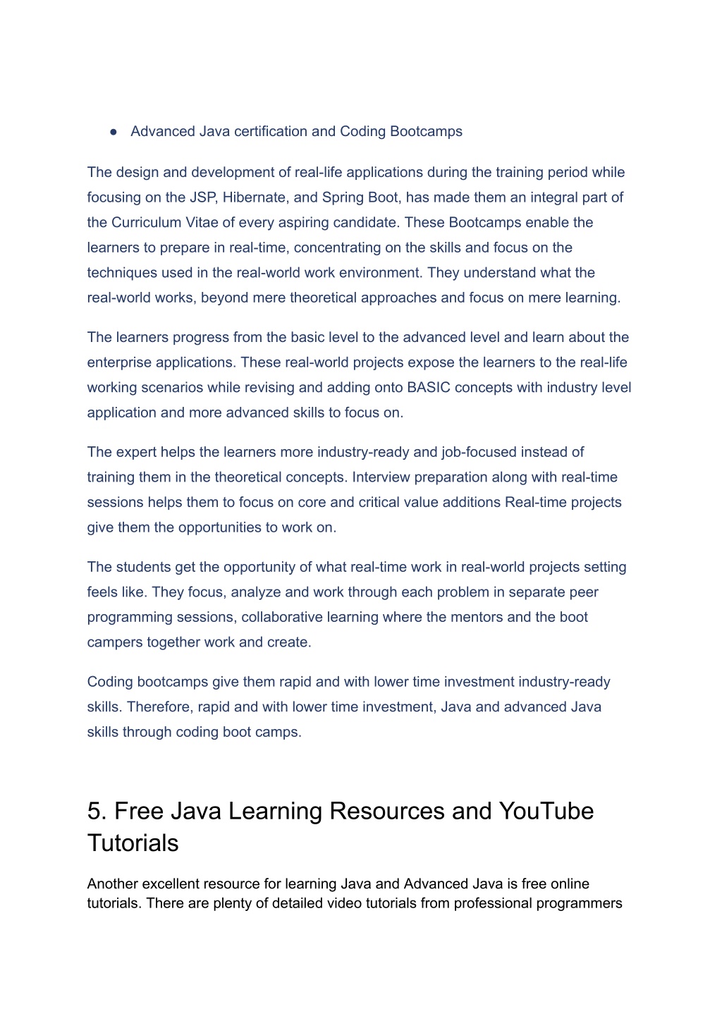 ● Advanced Java certification and Coding Bootcamps The design and development of real-life applications during the training period while focusing on the JSP, Hibernate, and Spring Boot, has made them an integral part of the Curriculum Vitae of every aspiring candidate. These Bootcamps enable the learners to prepare in real-time, concentrating on the skills and focus on the techniques used in the real-world work environment. They understand what the real-world works, beyond mere theoretical approaches and focus on mere learning. The learners progress from the basic level to the advanced level and learn about the enterprise applications. These real-world projects expose the learners to the real-life working scenarios while revising and adding onto BASIC concepts with industry level application and more advanced skills to focus on. The expert helps the learners more industry-ready and job-focused instead of training them in the theoretical concepts. Interview preparation along with real-time sessions helps them to focus on core and critical value additions Real-time projects give them the opportunities to work on. The students get the opportunity of what real-time work in real-world projects setting feels like. They focus, analyze and work through each problem in separate peer programming sessions, collaborative learning where the mentors and the boot campers together work and create. Coding bootcamps give them rapid and with lower time investment industry-ready skills. Therefore, rapid and with lower time investment, Java and advanced Java skills through coding boot camps. 5. Free Java Learning Resources and YouTube Tutorials Another excellent resource for learning Java and Advanced Java is free online tutorials. There are plenty of detailed video tutorials from professional programmers