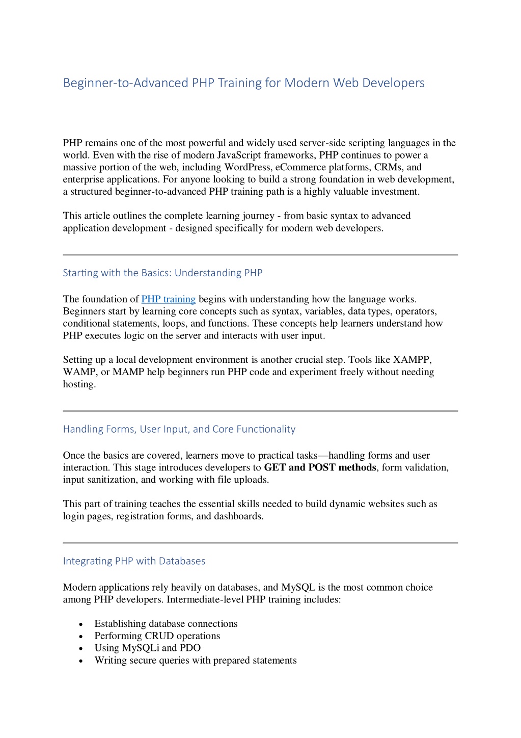 1. Beginner-to-Advanced PHP Training for Modern Web Developers PHP remains one of the most powerful and widely used server-side scripting languages in the world. Even with the rise of modern JavaScript frameworks, PHP continues to power a massive portion of the web, including WordPress, eCommerce platforms, CRMs, and enterprise applications. For anyone looking to build a strong foundation in web development, a structured beginner-to-advanced PHP training path is a highly valuable investment. This article outlines the complete learning journey - from basic syntax to advanced application development - designed specifically for modern web developers. Starting with the Basics: Understanding PHP The foundation of PHP training begins with understanding how the language works. Beginners start by learning core concepts such as syntax, variables, data types, operators, conditional statements, loops, and functions. These concepts help learners understand how PHP executes logic on the server and interacts with user input. Setting up a local development environment is another crucial step. Tools like XAMPP, WAMP, or MAMP help beginners run PHP code and experiment freely without needing hosting. Handling Forms, User Input, and Core Functionality Once the basics are covered, learners move to practical tasks—handling forms and user interaction. This stage introduces developers to GET and POST methods, form validation, input sanitization, and working with file uploads. This part of training teaches the essential skills needed to build dynamic websites such as login pages, registration forms, and dashboards. Integrating PHP with Databases Modern applications rely heavily on databases, and MySQL is the most common choice among PHP developers. Intermediate-level PHP training includes: Establishing database connections Performing CRUD operations Using MySQLi and PDO Writing secure queries with prepared statements
