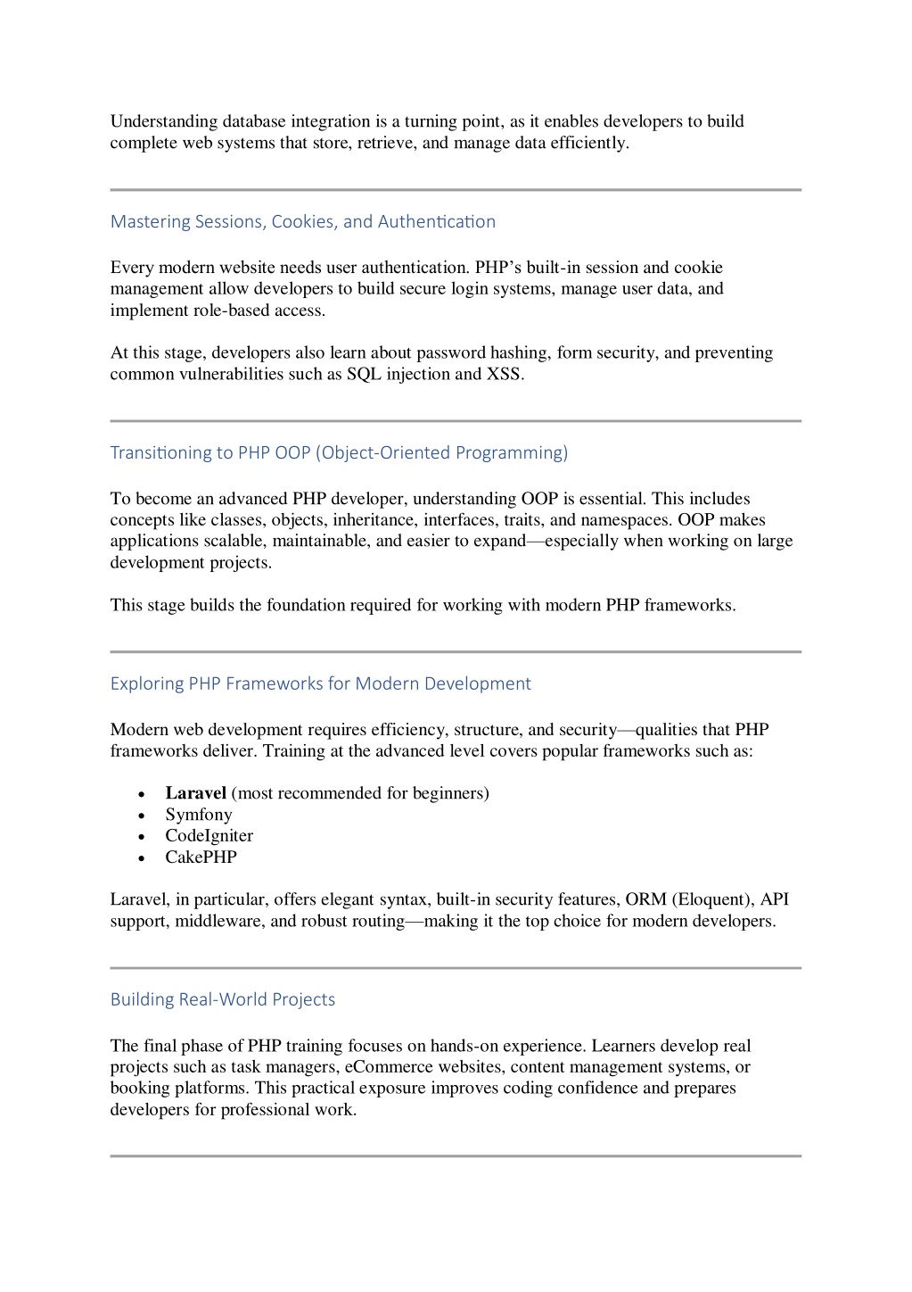 2. Understanding database integration is a turning point, as it enables developers to build complete web systems that store, retrieve, and manage data efficiently. Mastering Sessions, Cookies, and Authentication Every modern website needs user authentication. PHP’s built-in session and cookie management allow developers to build secure login systems, manage user data, and implement role-based access. At this stage, developers also learn about password hashing, form security, and preventing common vulnerabilities such as SQL injection and XSS. Transitioning to PHP OOP (Object-Oriented Programming) To become an advanced PHP developer, understanding OOP is essential. This includes concepts like classes, objects, inheritance, interfaces, traits, and namespaces. OOP makes applications scalable, maintainable, and easier to expand—especially when working on large development projects. This stage builds the foundation required for working with modern PHP frameworks. Exploring PHP Frameworks for Modern Development Modern web development requires efficiency, structure, and security—qualities that PHP frameworks deliver. Training at the advanced level covers popular frameworks such as: Laravel (most recommended for beginners) Symfony CodeIgniter CakePHP Laravel, in particular, offers elegant syntax, built-in security features, ORM (Eloquent), API support, middleware, and robust routing—making it the top choice for modern developers. Building Real-World Projects The final phase of PHP training focuses on hands-on experience. Learners develop real projects such as task managers, eCommerce websites, content management systems, or booking platforms. This practical exposure improves coding confidence and prepares developers for professional work.