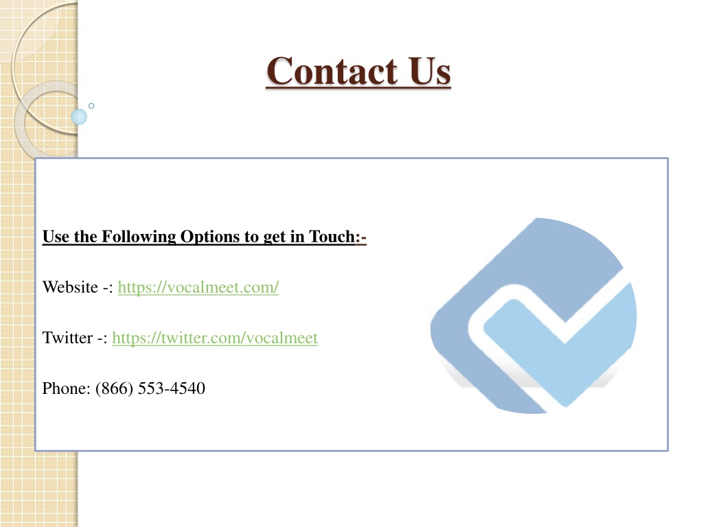 Contact Us Use the Following Options to get in Touch:- Website -: https://vocalmeet.com/ Twitter -: https://twitter.com/vocalmeet Phone: (866) 553-4540