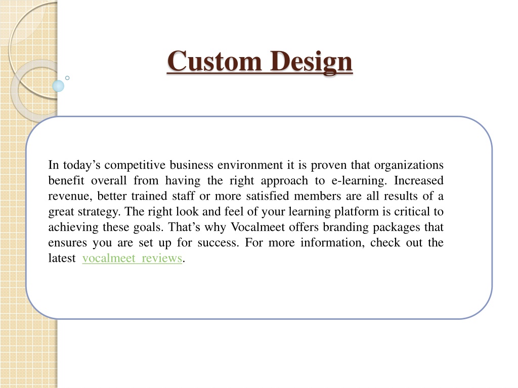 Custom Design In today’s competitive business environment it is proven that organizations benefit overall from having the right approach to e-learning. Increased revenue, better trained staff or more satisfied members are all results of a great strategy. The right look and feel of your learning platform is critical to achieving these goals. That’s why Vocalmeet offers branding packages that ensures you are set up for success. For more information, check out the latest vocalmeet reviews.