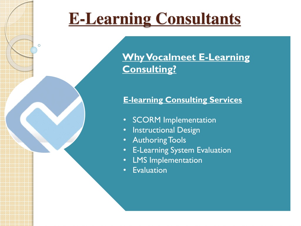 E-Learning Consultants Why Vocalmeet E-Learning Consulting? • E-learning Consulting Services • SCORM Implementation • Instructional Design • Authoring Tools • E-Learning System Evaluation • LMS Implementation • Evaluation
