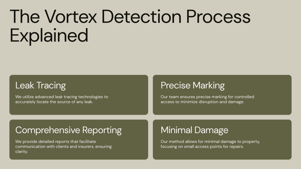 The Vortex Detection Process Explained Leak Tracing Precise Marking We utilize advanced leak tracing technologies to accurately locate the source of any leak. Our team ensures precise marking for controlled access to minimize disruption and damage. Comprehensive Reporting Minimal Damage We provide detailed reports that facilitate communication with clients and insurers, ensuring clarity. Our method allows for minimal damage to property, focusing on small access points for repairs.