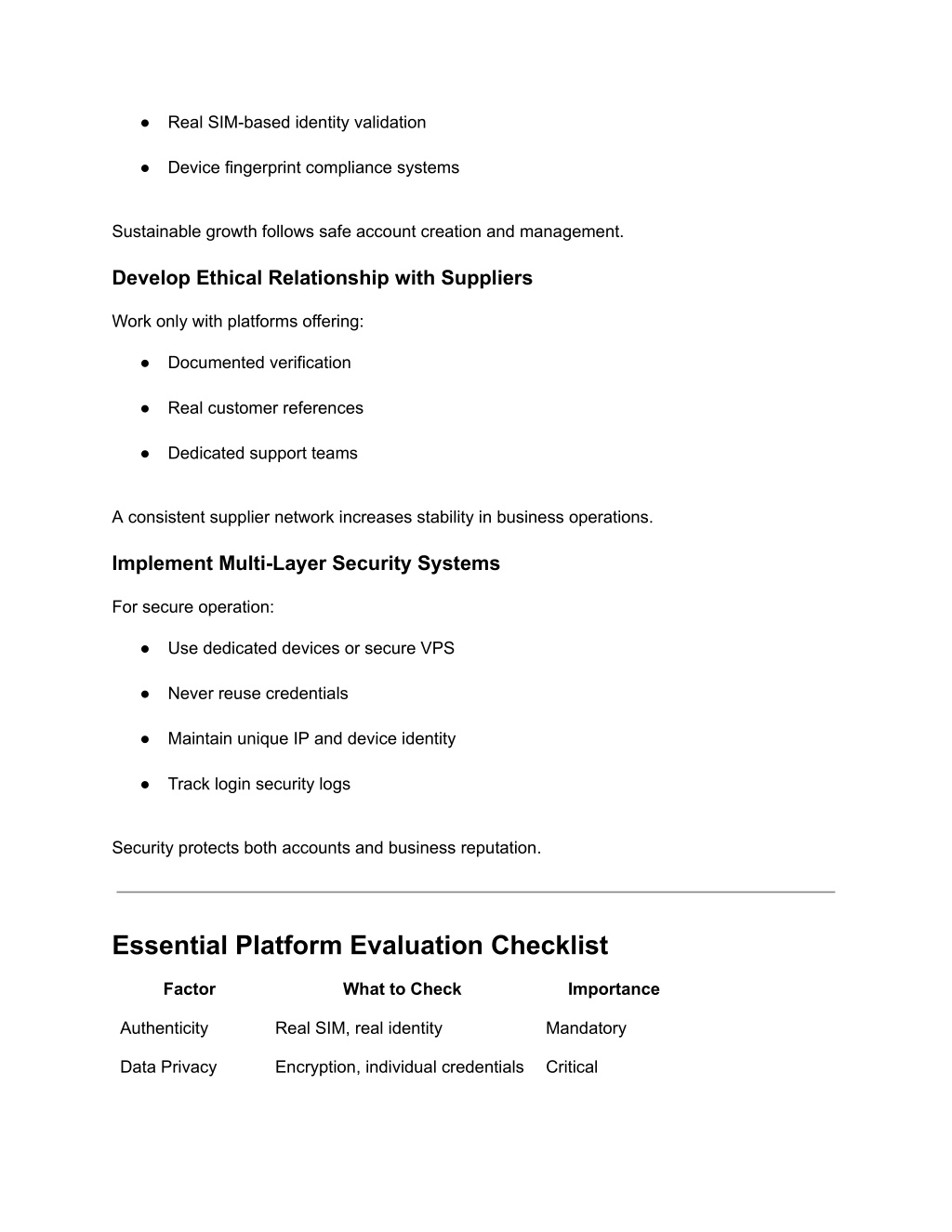5. ● Real SIM-based identity validation ● Device fingerprint compliance systems Sustainable growth follows safe account creation and management. Develop Ethical Relationship with Suppliers Work only with platforms offering: ● Documented verification ● Real customer references ● Dedicated support teams A consistent supplier network increases stability in business operations. Implement Multi-Layer Security Systems For secure operation: ● Use dedicated devices or secure VPS ● Never reuse credentials ● Maintain unique IP and device identity ● Track login security logs Security protects both accounts and business reputation. Essential Platform Evaluation Checklist Factor What to Check Importance Authenticity Real SIM, real identity Mandatory Data Privacy Encryption, individual credentials Critical