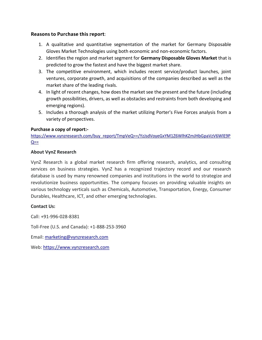 ????????????????????? r r?????: 1.A qualitative and quantitative segmentation of the market for Germany Disposable Gloves Market Technologies using both economic and non-economic factors. 2.Identifies the region and market segment for Germany Disposable Gloves Market that is predicted to grow the fastest and have the biggest market share. 3.The competitive environment, which includes recent service/product launches, joint ventures, corporate growth, and acquisitions of the companies described as well as the market share of the leading rivals. 4.In light of recent changes, how does the market see the present and the future (including growth possibilities, drivers, as well as obstacles and restraints from both developing and emerging regions). 5.Includes a thorough analysis of the market utilizing Porter's Five Forces analysis from a variety of perspectives. Purchase a copy of report:- https://www.vynzresearch.com/buy_report/TmpVeQ==/YzJsdVoyeGxYM1Z6WlhKZmJHbGpaVzV6WlE9P Q== About VynZ Research VynZ Research is a global market research firm offering research, analytics, and consulting services on business strategies. VynZ has a recognized trajectory record and our research database is used by many renowned companies and institutions in the world to strategize and revolutionize business opportunities. The company focuses on providing valuable insights on various technology verticals such as Chemicals, Automotive, Transportation, Energy, Consumer Durables, Healthcare, ICT, and other emerging technologies. Contact Us: Call: +91-996-028-8381 Toll-Free (U.S. and Canada): +1-888-253-3960 Email: marketing@vynzresearch.com Web: https://www.vynzresearch.com