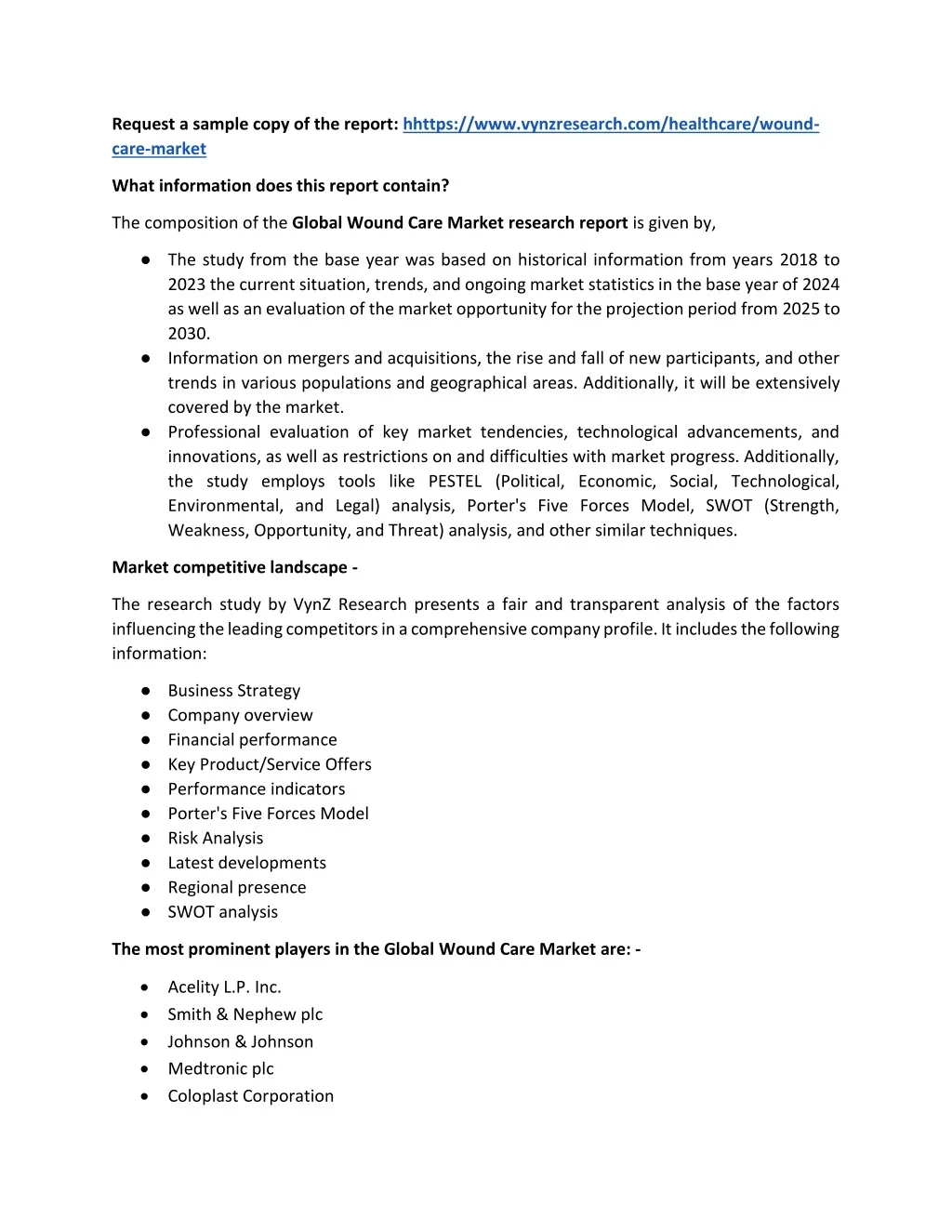 Request a sample copy of the report: hhttps://www.vynzresearch.com/healthcare/wound- care-market What information does this report contain? The composition of the GlobalWound Care Market research report is given by, ●The study from the base year was based on historical information from years 2018 to 2023 the current situation, trends, and ongoing market statistics in the base year of 2024 as well as an evaluation of the market opportunity for the projection period from 2025 to 2030. ●Information on mergers and acquisitions, the rise and fall of new participants, and other trends in various populations and geographical areas. Additionally, it will be extensively covered by the market. ●Professional evaluation of key market tendencies, technological advancements, and innovations, as well as restrictions on and difficulties with market progress. Additionally, the study employs tools like PESTEL (Political, Economic, Social, Technological, Environmental, and Legal) analysis, Porter's Five Forces Model, SWOT (Strength, Weakness, Opportunity, and Threat) analysis, and other similar techniques. Market competitive landscape - The research study by VynZ Research presents a fair and transparent analysis of the factors influencing the leading competitors in a comprehensive company profile. It includes the following information: ●Business Strategy ●Company overview ●Financial performance ●Key Product/Service Offers ●Performance indicators ●Porter's Five Forces Model ●Risk Analysis ●Latest developments ●Regional presence ●SWOT analysis The most prominent players in the Global Wound Care Market are: - •Acelity L.P. Inc. •Smith & Nephew plc •Johnson & Johnson •Medtronic plc •Coloplast Corporation