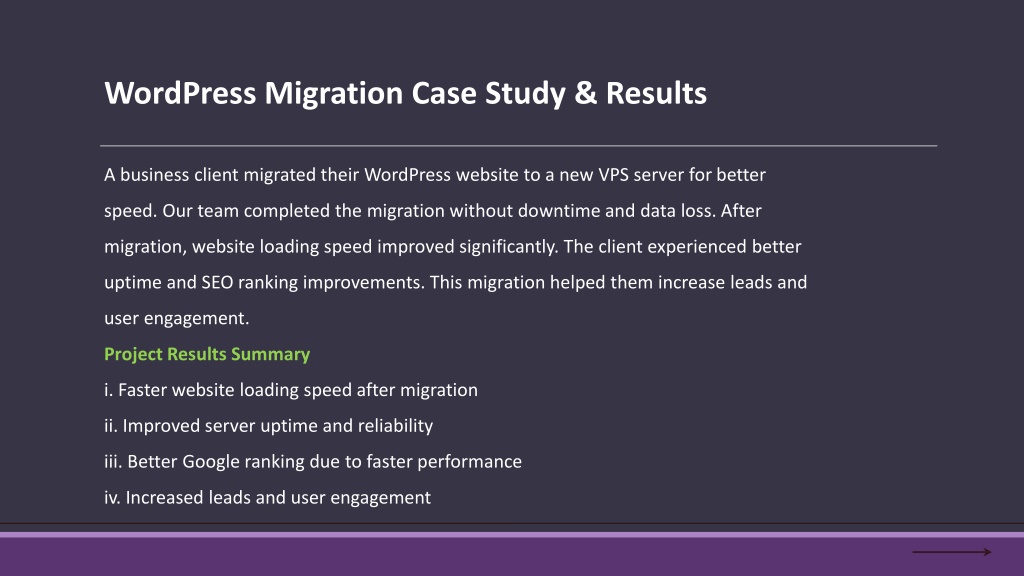 WordPress Migration Case Study & Results A business client migrated their WordPress website to a new VPS server for better speed. Our team completed the migration without downtime and data loss. After migration, website loading speed improved significantly. The client experienced better uptime and SEO ranking improvements. This migration helped them increase leads and user engagement. Project Results Summary i. Faster website loading speed after migrationii. Improved server uptime and reliabilityiii. Better Google ranking due to faster performanceiv. Increased leads and user engagement