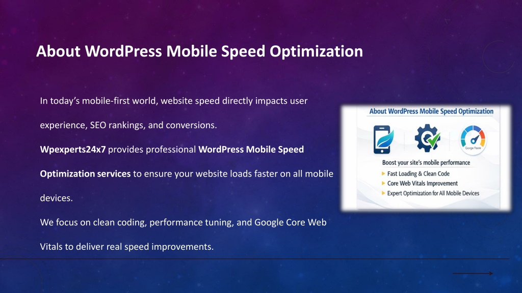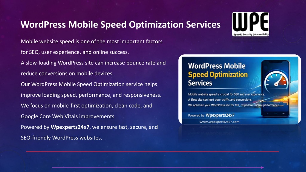 Boost your WordPress websiteu2019s mobile performance with professional WordPress Mobile Speed Optimization services by Wpexperts24x7. Our experts improve mobile loading speed, Core Web Vitals, and responsiveness, helping your site rank higher on Google and engage more users.<br><br>Get fast, secure, and SEO-friendly WordPress websites today. Visit: https://wpexperts24x7.com/wordpress-services/
