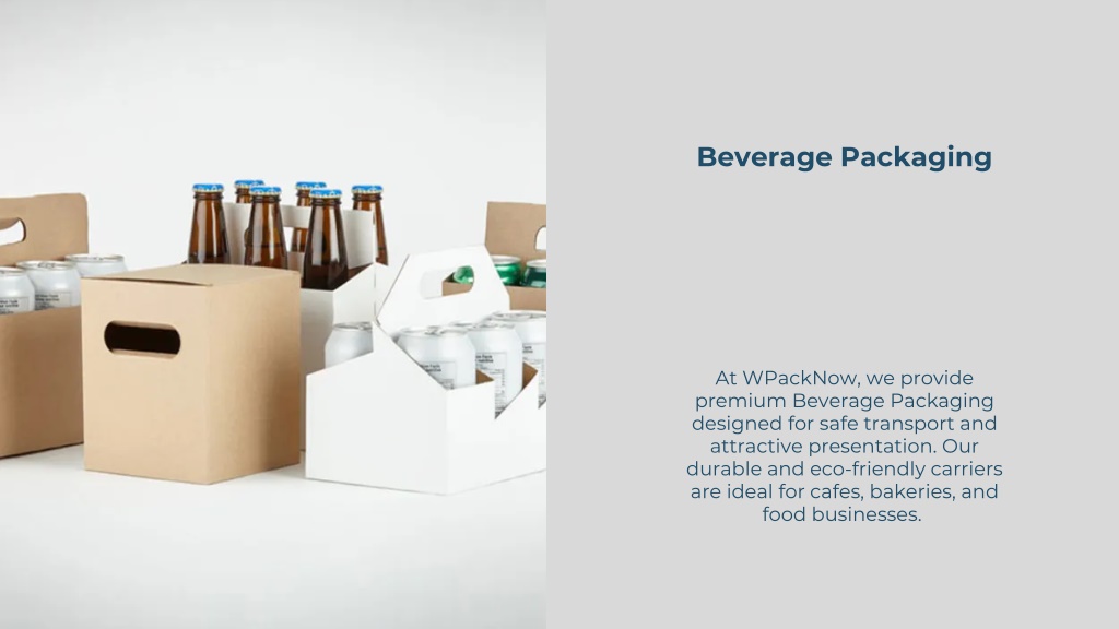 5. Beverage Packaging At WPackNow, we provide premium Beverage Packaging designed for safe transport and attractive presentation. Our durable and eco-friendly carriers are ideal for cafes, bakeries, and food businesses.