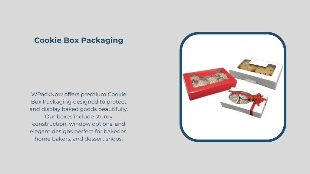 4. Cookie Box Packaging WPackNow offers premium Cookie Box Packaging designed to protect and display baked goods beautifully. Our boxes include sturdy construction, window options, and elegant designs perfect for bakeries, home bakers, and dessert shops.