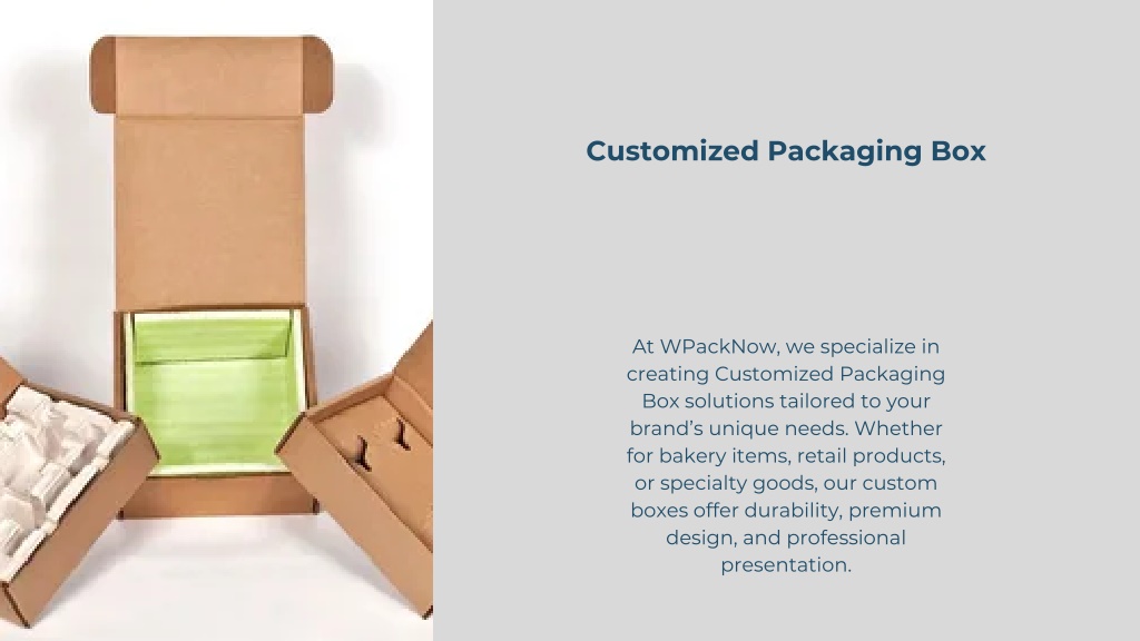 3. Customized Packaging Box At WPackNow, we specialize in creating Customized Packaging Box solutions tailored to your brand’s unique needs. Whether for bakery items, retail products, or specialty goods, our custom boxes offer durability, premium design, and professional presentation.