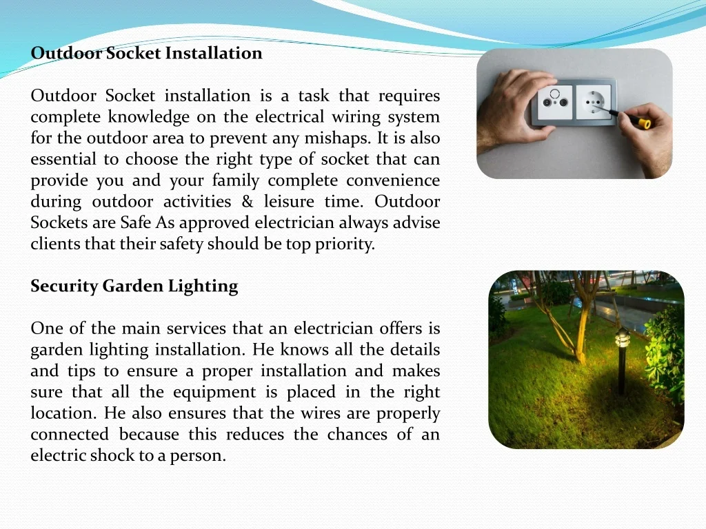 Outdoor Socket Installation Outdoor Socket installation is a task that requires complete knowledge on the electrical wiring system for the outdoor area to prevent any mishaps. It is also essential to choose the right type of socket that can provide you and your family complete convenience during outdoor activities & leisure time. Outdoor Sockets are Safe As approved electrician always advise clients that their safety should be top priority. Security Garden Lighting One of the main services that an electrician offers is garden lighting installation. He knows all the details and tips to ensure a proper installation and makes sure that all the equipment is placed in the right location. He also ensures that the wires are properly connected because this reduces the chances of an electric shock to a person.