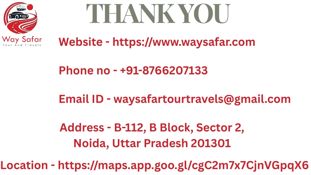 THANK YOU Website - https://www.waysafar.com Phone no - +91-8766207133 Email ID - waysafartourtravels@gmail.com Address - B-112, B Block, Sector 2, Noida, Uttar Pradesh 201301 Location - https://maps.app.goo.gl/cgC2m7x7CjnVGpqX6