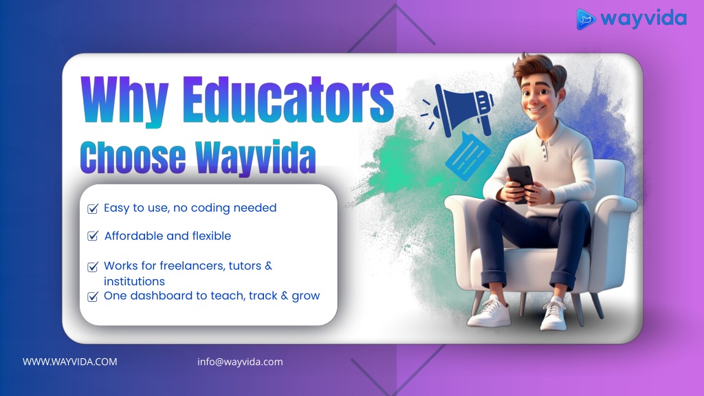 Easy to use, no coding needed Affordable and flexible Works for freelancers, tutors & institutions One dashboard to teach, track & grow WWW.WAYVIDA.COM info@wayvida.com