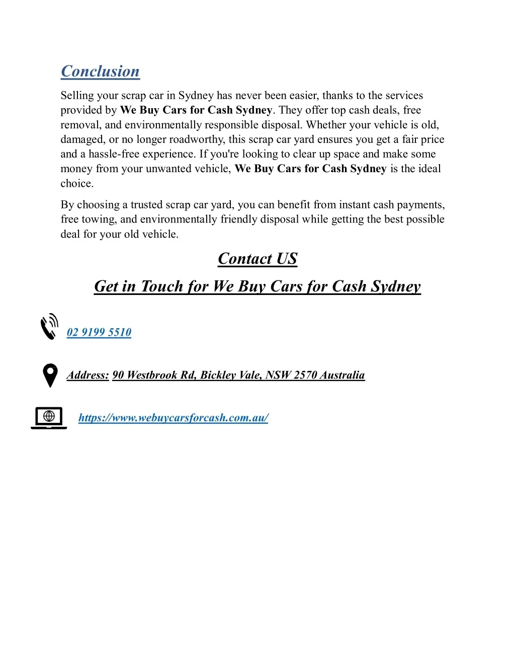 Conclusion Selling your scrap car in Sydney has never been easier, thanks to the services provided by We Buy Cars for Cash Sydney. They offer top cash deals, free removal, and environmentally responsible disposal. Whether your vehicle is old, damaged, or no longer roadworthy, this scrap car yard ensures you get a fair price and a hassle-free experience. If you're looking to clear up space and make some money from your unwanted vehicle, We Buy Cars for Cash Sydney is the ideal choice. By choosing a trusted scrap car yard, you can benefit from instant cash payments, free towing, and environmentally friendly disposal while getting the best possible deal for your old vehicle. Contact US Get in Touch for We Buy Cars for Cash Sydney 02 9199 5510 Address: 90 Westbrook Rd, Bickley Vale, NSW 2570 Australia https://www.webuycarsforcash.com.au/