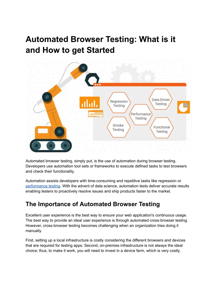 1. Automated Browser Testing: What is it and How to get Started Automated browser testing, simply put, is the use of automation during browser testing. Developers use automation tool sets or frameworks to execute defined tasks to test browsers and check their functionality. Automation assists developers with time-consuming and repetitive tasks like regression or performance testing. With the advent of data science, automation tests deliver accurate results enabling testers to proactively resolve issues and ship products faster to the market. The Importance of Automated Browser Testing Excellent user experience is the best way to ensure your web application's continuous usage. The best way to provide an ideal user experience is through automated cross-browser testing. However, cross-browser testing becomes challenging when an organization tries doing it manually. First, setting up a local infrastructure is costly considering the different browsers and devices that are required for testing apps. Second, on-premise infrastructure is not always the ideal choice; thus, to make it work, you will need to invest in a device farm, which is very costly.