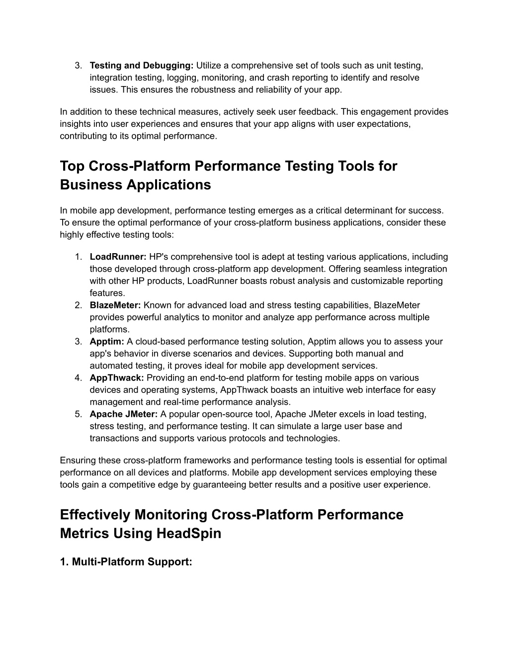 3. Testing and Debugging: Utilize a comprehensive set of tools such as unit testing, integration testing, logging, monitoring, and crash reporting to identify and resolve issues. This ensures the robustness and reliability of your app. In addition to these technical measures, actively seek user feedback. This engagement provides insights into user experiences and ensures that your app aligns with user expectations, contributing to its optimal performance. Top Cross-Platform Performance Testing Tools for Business Applications In mobile app development, performance testing emerges as a critical determinant for success. To ensure the optimal performance of your cross-platform business applications, consider these highly effective testing tools: 1. LoadRunner: HP's comprehensive tool is adept at testing various applications, including those developed through cross-platform app development. Offering seamless integration with other HP products, LoadRunner boasts robust analysis and customizable reporting features. 2. BlazeMeter: Known for advanced load and stress testing capabilities, BlazeMeter provides powerful analytics to monitor and analyze app performance across multiple platforms. 3. Apptim: A cloud-based performance testing solution, Apptim allows you to assess your app's behavior in diverse scenarios and devices. Supporting both manual and automated testing, it proves ideal for mobile app development services. 4. AppThwack: Providing an end-to-end platform for testing mobile apps on various devices and operating systems, AppThwack boasts an intuitive web interface for easy management and real-time performance analysis. 5. Apache JMeter: A popular open-source tool, Apache JMeter excels in load testing, stress testing, and performance testing. It can simulate a large user base and transactions and supports various protocols and technologies. Ensuring these cross-platform frameworks and performance testing tools is essential for optimal performance on all devices and platforms. Mobile app development services employing these tools gain a competitive edge by guaranteeing better results and a positive user experience. Effectively Monitoring Cross-Platform Performance Metrics Using HeadSpin 1. Multi-Platform Support: