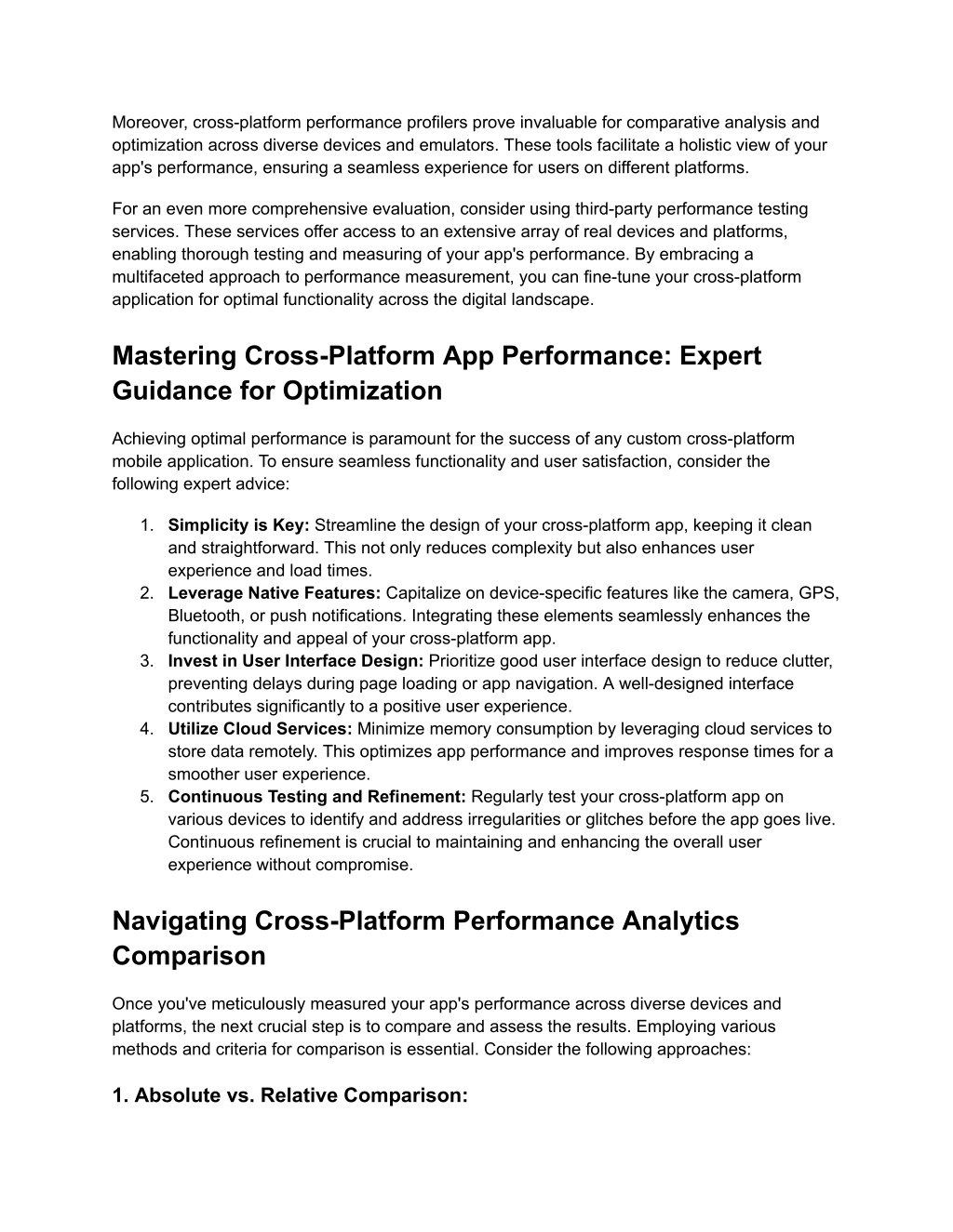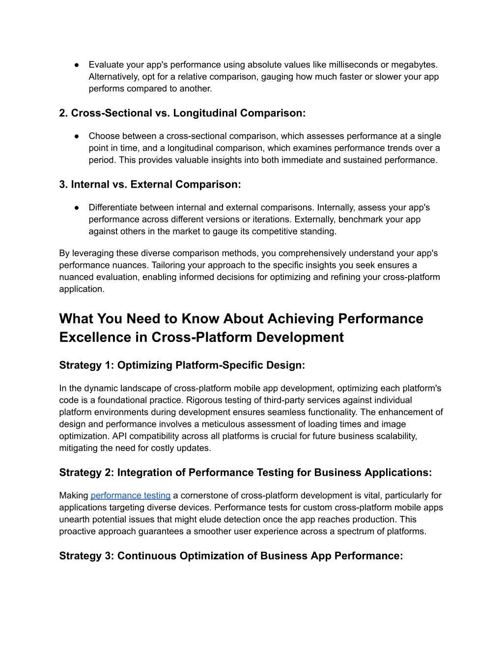 ● Evaluate your app's performance using absolute values like milliseconds or megabytes. Alternatively, opt for a relative comparison, gauging how much faster or slower your app performs compared to another. 2. Cross-Sectional vs. Longitudinal Comparison: ● Choose between a cross-sectional comparison, which assesses performance at a single point in time, and a longitudinal comparison, which examines performance trends over a period. This provides valuable insights into both immediate and sustained performance. 3. Internal vs. External Comparison: ● Differentiate between internal and external comparisons. Internally, assess your app's performance across different versions or iterations. Externally, benchmark your app against others in the market to gauge its competitive standing. By leveraging these diverse comparison methods, you comprehensively understand your app's performance nuances. Tailoring your approach to the specific insights you seek ensures a nuanced evaluation, enabling informed decisions for optimizing and refining your cross-platform application. What You Need to Know About Achieving Performance Excellence in Cross-Platform Development Strategy 1: Optimizing Platform-Specific Design: In the dynamic landscape of cross-platform mobile app development, optimizing each platform's code is a foundational practice. Rigorous testing of third-party services against individual platform environments during development ensures seamless functionality. The enhancement of design and performance involves a meticulous assessment of loading times and image optimization. API compatibility across all platforms is crucial for future business scalability, mitigating the need for costly updates. Strategy 2: Integration of Performance Testing for Business Applications: Making performance testing a cornerstone of cross-platform development is vital, particularly for applications targeting diverse devices. Performance tests for custom cross-platform mobile apps unearth potential issues that might elude detection once the app reaches production. This proactive approach guarantees a smoother user experience across a spectrum of platforms. Strategy 3: Continuous Optimization of Business App Performance: