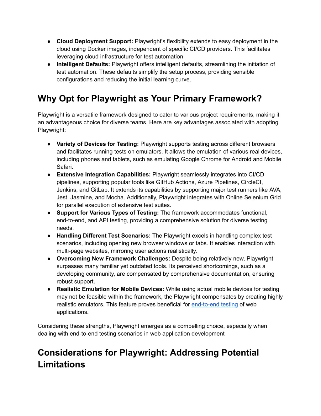 ● Cloud Deployment Support: Playwright's flexibility extends to easy deployment in the cloud using Docker images, independent of specific CI/CD providers. This facilitates leveraging cloud infrastructure for test automation. ● Intelligent Defaults: Playwright offers intelligent defaults, streamlining the initiation of test automation. These defaults simplify the setup process, providing sensible configurations and reducing the initial learning curve. Why Opt for Playwright as Your Primary Framework? Playwright is a versatile framework designed to cater to various project requirements, making it an advantageous choice for diverse teams. Here are key advantages associated with adopting Playwright: ● Variety of Devices for Testing: Playwright supports testing across different browsers and facilitates running tests on emulators. It allows the emulation of various real devices, including phones and tablets, such as emulating Google Chrome for Android and Mobile Safari. ● Extensive Integration Capabilities: Playwright seamlessly integrates into CI/CD pipelines, supporting popular tools like GitHub Actions, Azure Pipelines, CircleCI, Jenkins, and GitLab. It extends its capabilities by supporting major test runners like AVA, Jest, Jasmine, and Mocha. Additionally, Playwright integrates with Online Selenium Grid for parallel execution of extensive test suites. ● Support for Various Types of Testing: The framework accommodates functional, end-to-end, and API testing, providing a comprehensive solution for diverse testing needs. ● Handling Different Test Scenarios: The Playwright excels in handling complex test scenarios, including opening new browser windows or tabs. It enables interaction with multi-page websites, mirroring user actions realistically. ● Overcoming New Framework Challenges: Despite being relatively new, Playwright surpasses many familiar yet outdated tools. Its perceived shortcomings, such as a developing community, are compensated by comprehensive documentation, ensuring robust support. ● Realistic Emulation for Mobile Devices: While using actual mobile devices for testing may not be feasible within the framework, the Playwright compensates by creating highly realistic emulators. This feature proves beneficial for end-to-end testing of web applications. Considering these strengths, Playwright emerges as a compelling choice, especially when dealing with end-to-end testing scenarios in web application development Considerations for Playwright: Addressing Potential Limitations