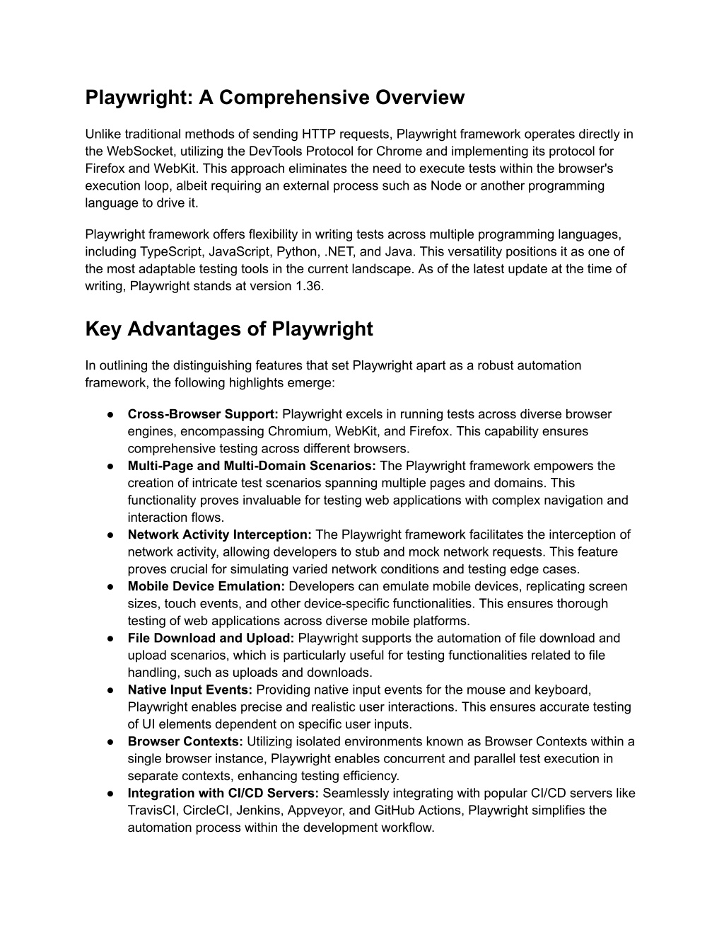 Playwright: A Comprehensive Overview Unlike traditional methods of sending HTTP requests, Playwright framework operates directly in the WebSocket, utilizing the DevTools Protocol for Chrome and implementing its protocol for Firefox and WebKit. This approach eliminates the need to execute tests within the browser's execution loop, albeit requiring an external process such as Node or another programming language to drive it. Playwright framework offers flexibility in writing tests across multiple programming languages, including TypeScript, JavaScript, Python, .NET, and Java. This versatility positions it as one of the most adaptable testing tools in the current landscape. As of the latest update at the time of writing, Playwright stands at version 1.36. Key Advantages of Playwright In outlining the distinguishing features that set Playwright apart as a robust automation framework, the following highlights emerge: ● Cross-Browser Support: Playwright excels in running tests across diverse browser engines, encompassing Chromium, WebKit, and Firefox. This capability ensures comprehensive testing across different browsers. ● Multi-Page and Multi-Domain Scenarios: The Playwright framework empowers the creation of intricate test scenarios spanning multiple pages and domains. This functionality proves invaluable for testing web applications with complex navigation and interaction flows. ● Network Activity Interception: The Playwright framework facilitates the interception of network activity, allowing developers to stub and mock network requests. This feature proves crucial for simulating varied network conditions and testing edge cases. ● Mobile Device Emulation: Developers can emulate mobile devices, replicating screen sizes, touch events, and other device-specific functionalities. This ensures thorough testing of web applications across diverse mobile platforms. ● File Download and Upload: Playwright supports the automation of file download and upload scenarios, which is particularly useful for testing functionalities related to file handling, such as uploads and downloads. ● Native Input Events: Providing native input events for the mouse and keyboard, Playwright enables precise and realistic user interactions. This ensures accurate testing of UI elements dependent on specific user inputs. ● Browser Contexts: Utilizing isolated environments known as Browser Contexts within a single browser instance, Playwright enables concurrent and parallel test execution in separate contexts, enhancing testing efficiency. ● Integration with CI/CD Servers: Seamlessly integrating with popular CI/CD servers like TravisCI, CircleCI, Jenkins, Appveyor, and GitHub Actions, Playwright simplifies the automation process within the development workflow.