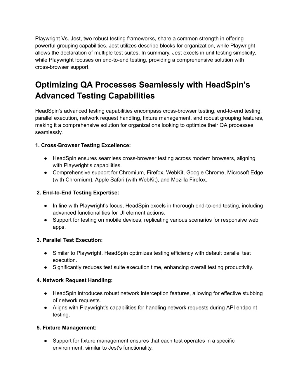 Playwright Vs. Jest, two robust testing frameworks, share a common strength in offering powerful grouping capabilities. Jest utilizes describe blocks for organization, while Playwright allows the declaration of multiple test suites. In summary, Jest excels in unit testing simplicity, while Playwright focuses on end-to-end testing, providing a comprehensive solution with cross-browser support. Optimizing QA Processes Seamlessly with HeadSpin's Advanced Testing Capabilities HeadSpin's advanced testing capabilities encompass cross-browser testing, end-to-end testing, parallel execution, network request handling, fixture management, and robust grouping features, making it a comprehensive solution for organizations looking to optimize their QA processes seamlessly. 1. Cross-Browser Testing Excellence: ● HeadSpin ensures seamless cross-browser testing across modern browsers, aligning with Playwright's capabilities. ● Comprehensive support for Chromium, Firefox, WebKit, Google Chrome, Microsoft Edge (with Chromium), Apple Safari (with WebKit), and Mozilla Firefox. 2. End-to-End Testing Expertise: ● In line with Playwright's focus, HeadSpin excels in thorough end-to-end testing, including advanced functionalities for UI element actions. ● Support for testing on mobile devices, replicating various scenarios for responsive web apps. 3. Parallel Test Execution: ● Similar to Playwright, HeadSpin optimizes testing efficiency with default parallel test execution. ● Significantly reduces test suite execution time, enhancing overall testing productivity. 4. Network Request Handling: ● HeadSpin introduces robust network interception features, allowing for effective stubbing of network requests. ● Aligns with Playwright's capabilities for handling network requests during API endpoint testing. 5. Fixture Management: ● Support for fixture management ensures that each test operates in a specific environment, similar to Jest's functionality.