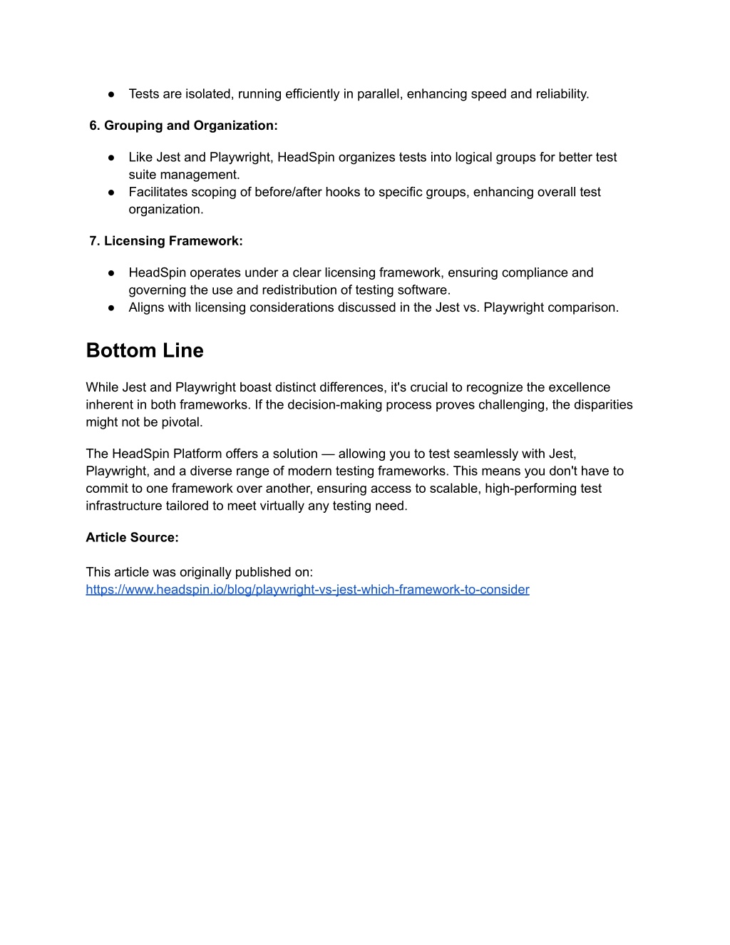 ● Tests are isolated, running efficiently in parallel, enhancing speed and reliability. 6. Grouping and Organization: ● Like Jest and Playwright, HeadSpin organizes tests into logical groups for better test suite management. ● Facilitates scoping of before/after hooks to specific groups, enhancing overall test organization. 7. Licensing Framework: ● HeadSpin operates under a clear licensing framework, ensuring compliance and governing the use and redistribution of testing software. ● Aligns with licensing considerations discussed in the Jest vs. Playwright comparison. Bottom Line While Jest and Playwright boast distinct differences, it's crucial to recognize the excellence inherent in both frameworks. If the decision-making process proves challenging, the disparities might not be pivotal. The HeadSpin Platform offers a solution — allowing you to test seamlessly with Jest, Playwright, and a diverse range of modern testing frameworks. This means you don't have to commit to one framework over another, ensuring access to scalable, high-performing test infrastructure tailored to meet virtually any testing need. Article Source: This article was originally published on: https://www.headspin.io/blog/playwright-vs-jest-which-framework-to-consider