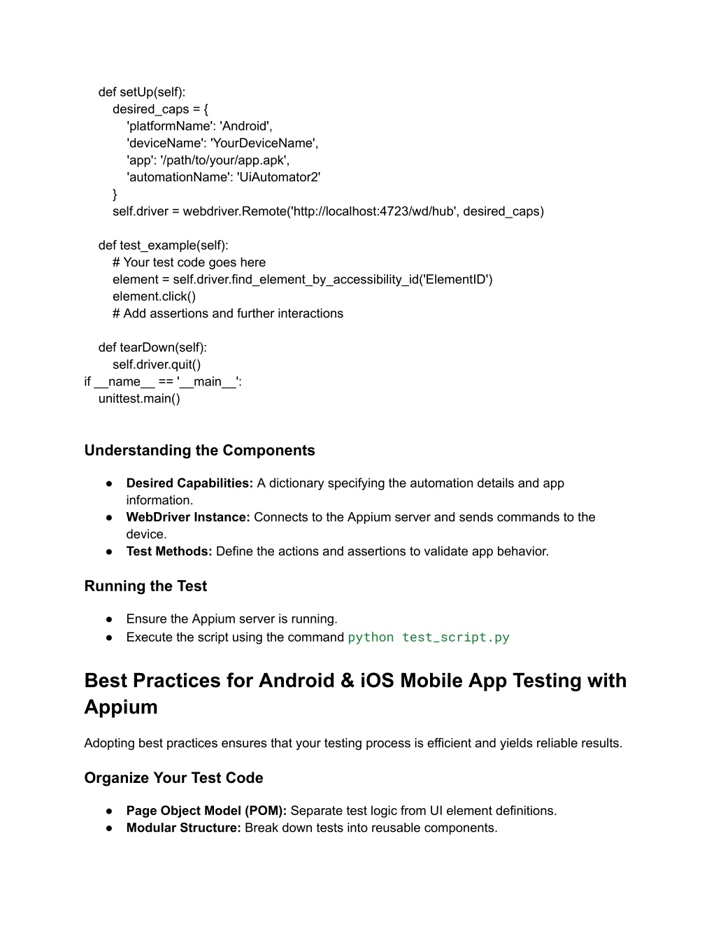 def setUp(self): desired_caps = { 'platformName': 'Android', 'deviceName': 'YourDeviceName', 'app': '/path/to/your/app.apk', 'automationName': 'UiAutomator2' } self.driver = webdriver.Remote('http://localhost:4723/wd/hub', desired_caps) def test_example(self): # Your test code goes here element = self.driver.find_element_by_accessibility_id('ElementID') element.click() # Add assertions and further interactions def tearDown(self): self.driver.quit() if __name__ == '__main__': unittest.main() Understanding the Components ● Desired Capabilities: A dictionary specifying the automation details and app information. ● WebDriver Instance: Connects to the Appium server and sends commands to the device. ● Test Methods: Define the actions and assertions to validate app behavior. Running the Test ● Ensure the Appium server is running. ● Execute the script using the command python test_script.py Best Practices for Android & iOS Mobile App Testing with Appium Adopting best practices ensures that your testing process is efficient and yields reliable results. Organize Your Test Code ● Page Object Model (POM): Separate test logic from UI element definitions. ● Modular Structure: Break down tests into reusable components.