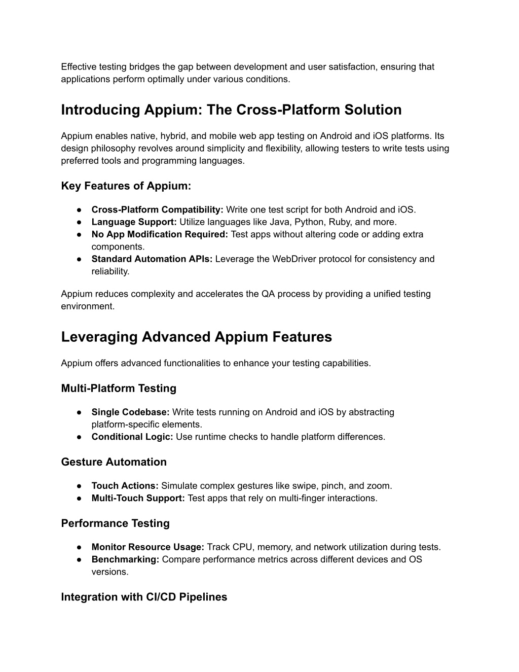 Effective testing bridges the gap between development and user satisfaction, ensuring that applications perform optimally under various conditions. Introducing Appium: The Cross-Platform Solution Appium enables native, hybrid, and mobile web app testing on Android and iOS platforms. Its design philosophy revolves around simplicity and flexibility, allowing testers to write tests using preferred tools and programming languages. Key Features of Appium: ● Cross-Platform Compatibility: Write one test script for both Android and iOS. ● Language Support: Utilize languages like Java, Python, Ruby, and more. ● No App Modification Required: Test apps without altering code or adding extra components. ● Standard Automation APIs: Leverage the WebDriver protocol for consistency and reliability. Appium reduces complexity and accelerates the QA process by providing a unified testing environment. Leveraging Advanced Appium Features Appium offers advanced functionalities to enhance your testing capabilities. Multi-Platform Testing ● Single Codebase: Write tests running on Android and iOS by abstracting platform-specific elements. ● Conditional Logic: Use runtime checks to handle platform differences. Gesture Automation ● Touch Actions: Simulate complex gestures like swipe, pinch, and zoom. ● Multi-Touch Support: Test apps that rely on multi-finger interactions. Performance Testing ● Monitor Resource Usage: Track CPU, memory, and network utilization during tests. ● Benchmarking: Compare performance metrics across different devices and OS versions. Integration with CI/CD Pipelines