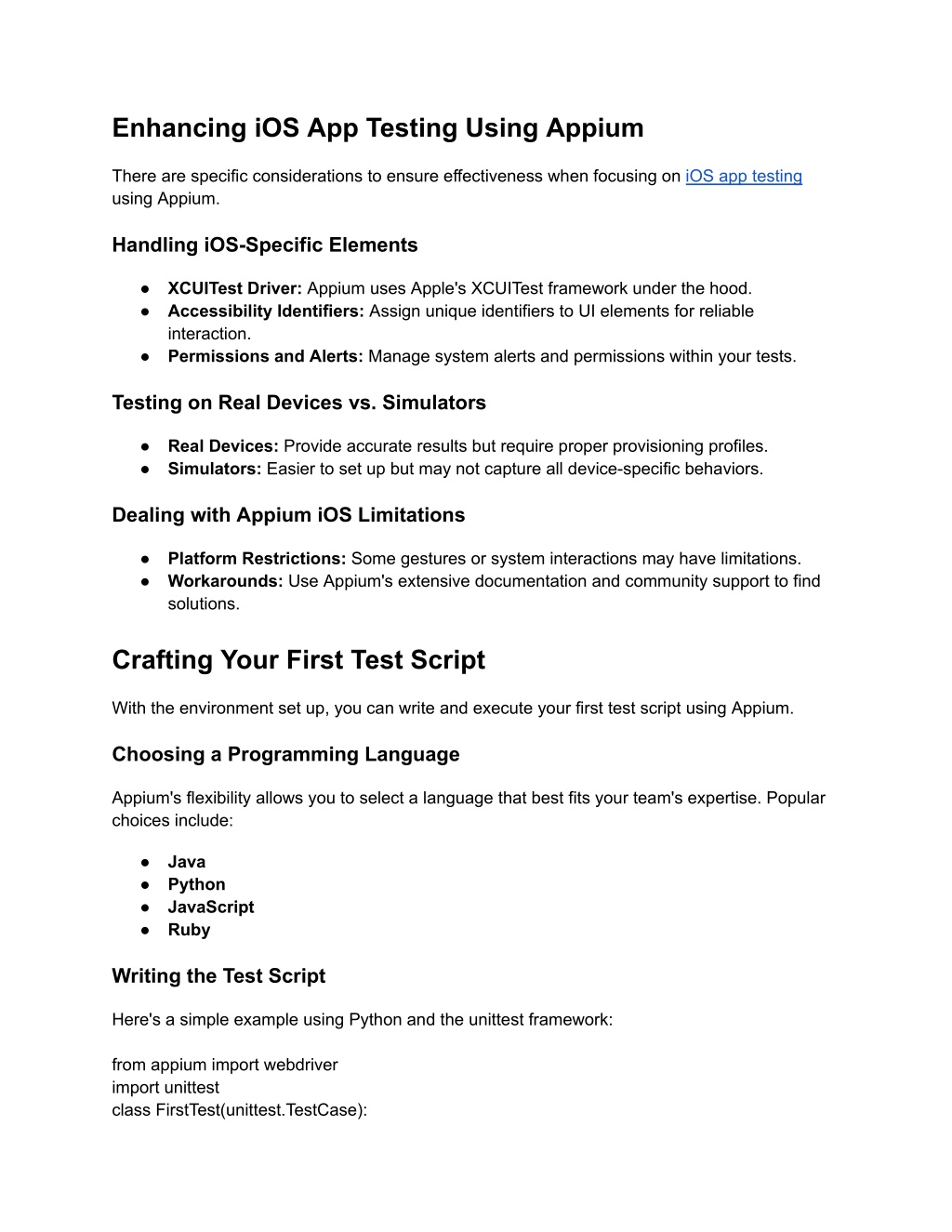 Enhancing iOS App Testing Using Appium There are specific considerations to ensure effectiveness when focusing on iOS app testing using Appium. Handling iOS-Specific Elements ● XCUITest Driver: Appium uses Apple's XCUITest framework under the hood. ● Accessibility Identifiers: Assign unique identifiers to UI elements for reliable interaction. ● Permissions and Alerts: Manage system alerts and permissions within your tests. Testing on Real Devices vs. Simulators ● Real Devices: Provide accurate results but require proper provisioning profiles. ● Simulators: Easier to set up but may not capture all device-specific behaviors. Dealing with Appium iOS Limitations ● Platform Restrictions: Some gestures or system interactions may have limitations. ● Workarounds: Use Appium's extensive documentation and community support to find solutions. Crafting Your First Test Script With the environment set up, you can write and execute your first test script using Appium. Choosing a Programming Language Appium's flexibility allows you to select a language that best fits your team's expertise. Popular choices include: ● Java ● Python ● JavaScript ● Ruby Writing the Test Script Here's a simple example using Python and the unittest framework: from appium import webdriver import unittest class FirstTest(unittest.TestCase):