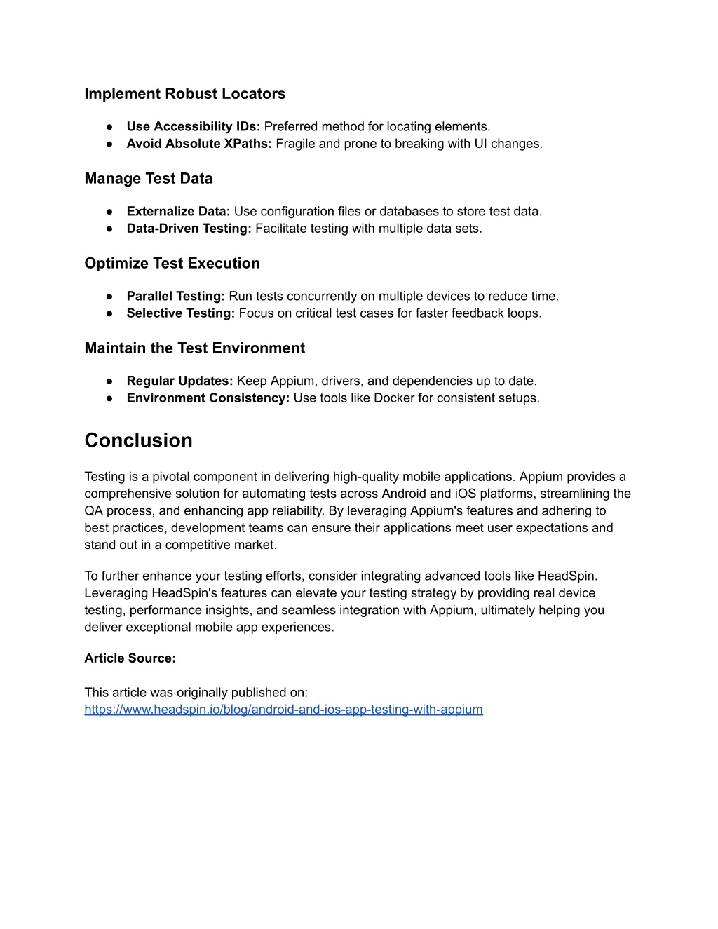 Implement Robust Locators ● Use Accessibility IDs: Preferred method for locating elements. ● Avoid Absolute XPaths: Fragile and prone to breaking with UI changes. Manage Test Data ● Externalize Data: Use configuration files or databases to store test data. ● Data-Driven Testing: Facilitate testing with multiple data sets. Optimize Test Execution ● Parallel Testing: Run tests concurrently on multiple devices to reduce time. ● Selective Testing: Focus on critical test cases for faster feedback loops. Maintain the Test Environment ● Regular Updates: Keep Appium, drivers, and dependencies up to date. ● Environment Consistency: Use tools like Docker for consistent setups. Conclusion Testing is a pivotal component in delivering high-quality mobile applications. Appium provides a comprehensive solution for automating tests across Android and iOS platforms, streamlining the QA process, and enhancing app reliability. By leveraging Appium's features and adhering to best practices, development teams can ensure their applications meet user expectations and stand out in a competitive market. To further enhance your testing efforts, consider integrating advanced tools like HeadSpin. Leveraging HeadSpin's features can elevate your testing strategy by providing real device testing, performance insights, and seamless integration with Appium, ultimately helping you deliver exceptional mobile app experiences. Article Source: This article was originally published on: https://www.headspin.io/blog/android-and-ios-app-testing-with-appium