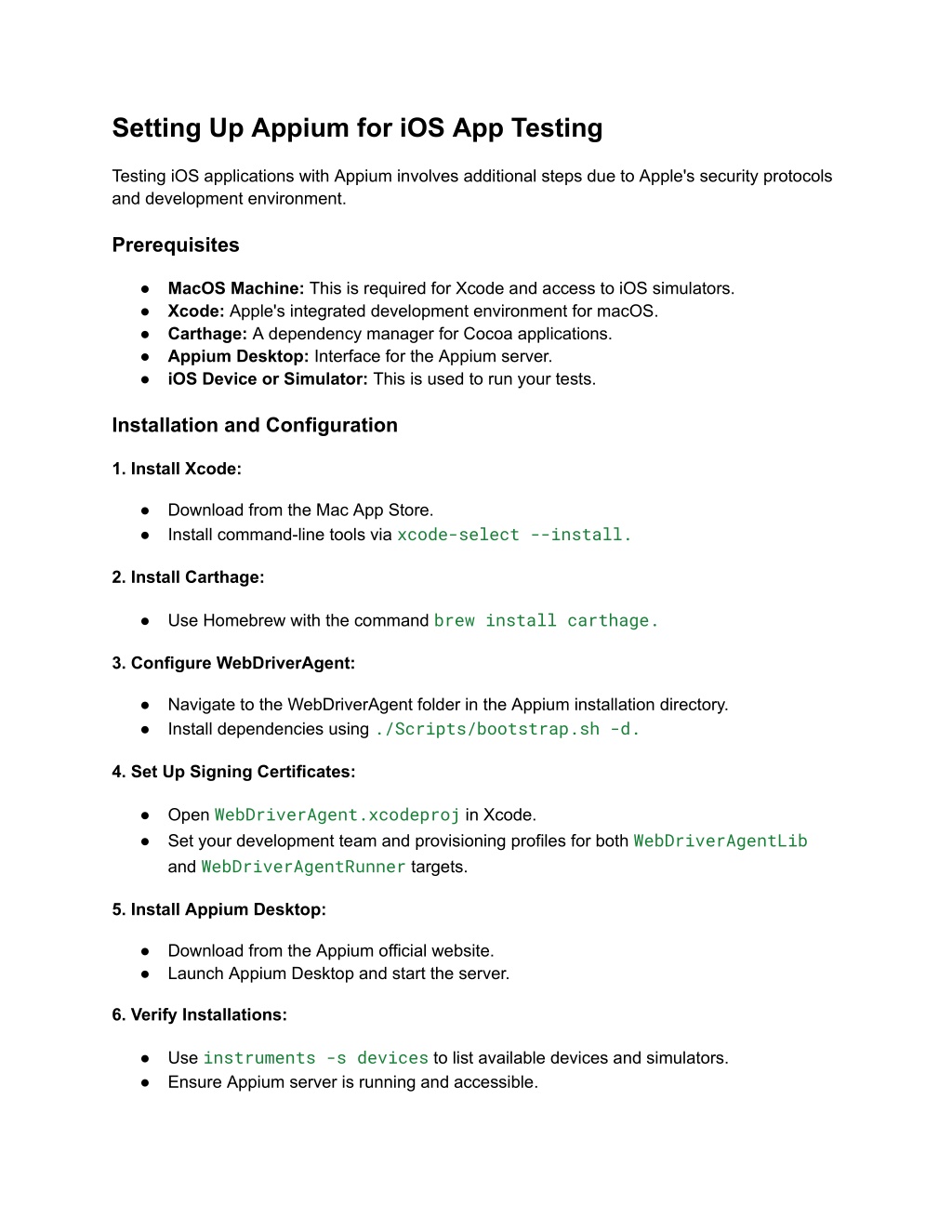 Setting Up Appium for iOS App Testing Testing iOS applications with Appium involves additional steps due to Apple's security protocols and development environment. Prerequisites ● MacOS Machine: This is required for Xcode and access to iOS simulators. ● Xcode: Apple's integrated development environment for macOS. ● Carthage: A dependency manager for Cocoa applications. ● Appium Desktop: Interface for the Appium server. ● iOS Device or Simulator: This is used to run your tests. Installation and Configuration 1. Install Xcode: ● Download from the Mac App Store. ● Install command-line tools via xcode-select --install. 2. Install Carthage: ● Use Homebrew with the command brew install carthage. 3. Configure WebDriverAgent: ● Navigate to the WebDriverAgent folder in the Appium installation directory. ● Install dependencies using ./Scripts/bootstrap.sh -d. 4. Set Up Signing Certificates: ● Open WebDriverAgent.xcodeproj in Xcode. ● Set your development team and provisioning profiles for both WebDriverAgentLib and WebDriverAgentRunner targets. 5. Install Appium Desktop: ● Download from the Appium official website. ● Launch Appium Desktop and start the server. 6. Verify Installations: ● Use instruments -s devices to list available devices and simulators. ● Ensure Appium server is running and accessible.