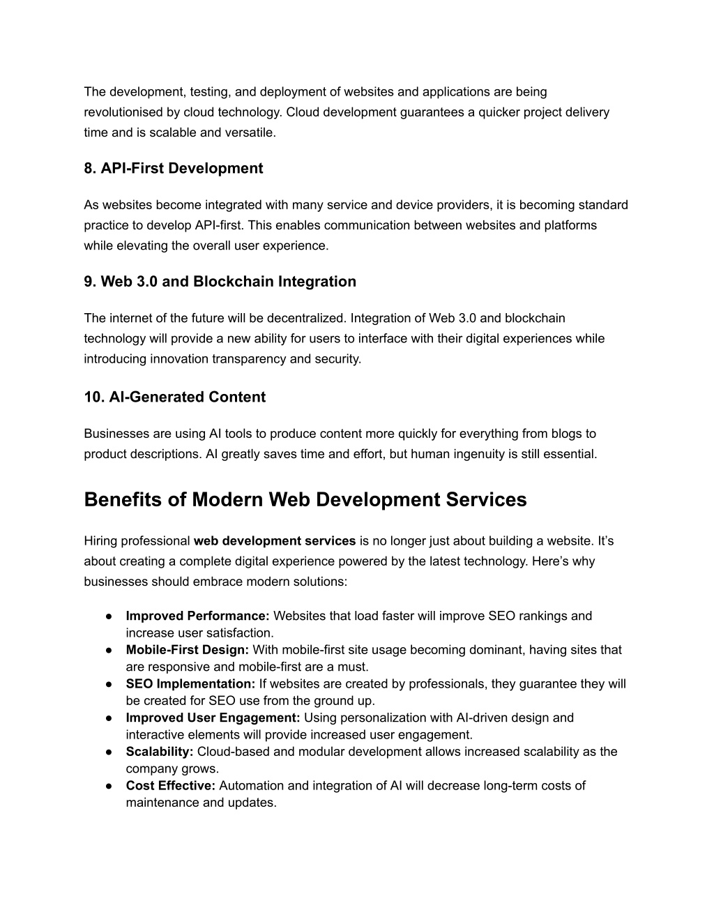 The development, testing, and deployment of websites and applications are being revolutionised by cloud technology. Cloud development guarantees a quicker project delivery time and is scalable and versatile. 8. API-First Development As websites become integrated with many service and device providers, it is becoming standard practice to develop API-first. This enables communication between websites and platforms while elevating the overall user experience. 9. Web 3.0 and Blockchain Integration The internet of the future will be decentralized. Integration of Web 3.0 and blockchain technology will provide a new ability for users to interface with their digital experiences while introducing innovation transparency and security. 10. AI-Generated Content Businesses are using AI tools to produce content more quickly for everything from blogs to product descriptions. AI greatly saves time and effort, but human ingenuity is still essential. Benefits of Modern Web Development Services Hiring professional web development services is no longer just about building a website. It’s about creating a complete digital experience powered by the latest technology. Here’s why businesses should embrace modern solutions: ● Improved Performance: Websites that load faster will improve SEO rankings and increase user satisfaction. ● Mobile-First Design: With mobile-first site usage becoming dominant, having sites that are responsive and mobile-first are a must. ● SEO Implementation: If websites are created by professionals, they guarantee they will be created for SEO use from the ground up. ● Improved User Engagement: Using personalization with AI-driven design and interactive elements will provide increased user engagement. ● Scalability: Cloud-based and modular development allows increased scalability as the company grows. ● Cost Effective: Automation and integration of AI will decrease long-term costs of maintenance and updates.