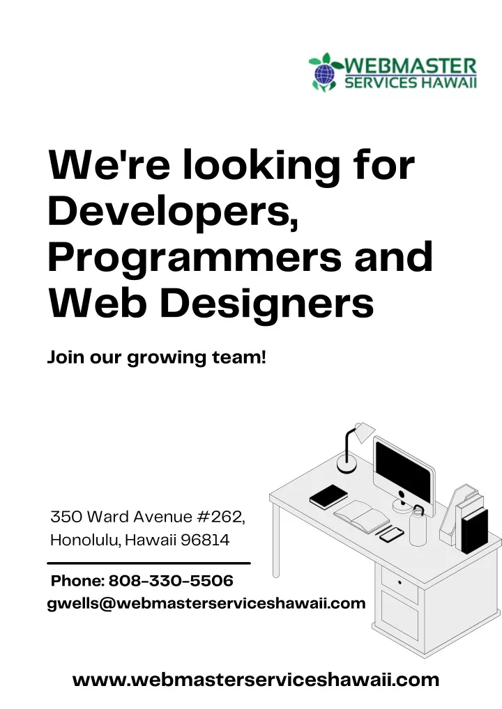 We're looking for Developers, Programmers and Web Designers Join our growing team! 350 Ward Avenue #262, Honolulu, Hawaii 96814 Phone: 808-330-5506 gwells@webmasterserviceshawaii.com www.webmasterserviceshawaii.com