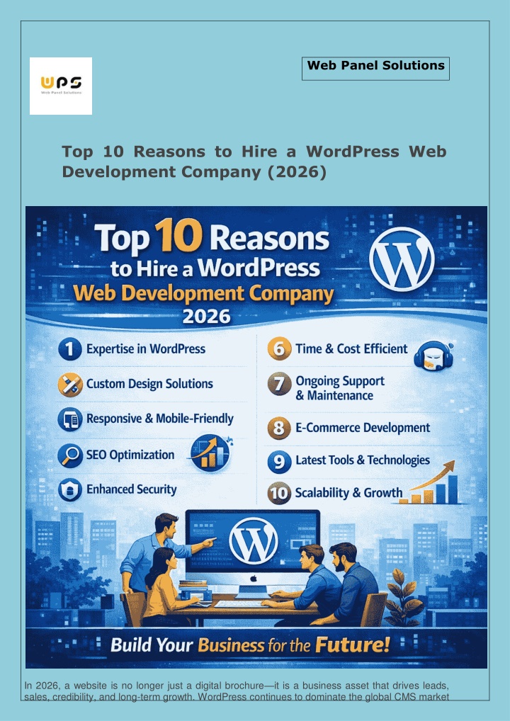 due to its flexibility, scalability, and powerful ecosystem. However, building a truly professional, secure, and performance-driven website requires more than installing a theme and a few plugins. This is where hiring a professional WordPress Web Development Company becomes essential. Instead of relying on DIY solutions or freelancers with limited scope, businesses benefit significantly from working with an experienced development team that understands both technology and business goals. Below are the top 10 reasons why hiring a WordPress web development company in 2026 is a smart investment for businesses of all sizes. 1. Individualized Solutions Built Around Your Business Goals Every business has unique requirements, whether it’s lead generation, eCommerce, content publishing, or enterprise integration. A professional WordPress development company doesn’t rely on generic templates alone. Instead, it builds tailored solutions aligned with your objectives. From custom themes to feature-specific plugins, professional developers ensure that your website supports your business workflow, user journey, and future growth. This level of customization is difficult to achieve with off-the-shelf solutions. At Web Panel Solutions, projects begin with understanding business intent, ensuring the final website delivers measurable results—not just visual appeal. 2. Originality and Creative Design That Stands Out In a crowded digital space, originality matters. A professionally developed WordPress website reflects brand identity through thoughtful design, layout structure, typography, and user interaction. A WordPress web development company brings together designers and developers to create visually engaging websites that are both creative and functional. This balance ensures your site not only looks unique but also performs smoothly across devices. Rather than using recycled layouts, professional teams design interfaces that enhance brand recall and user trust. 3. Reliable Technical Expertise and Problem-Solving Ability WordPress may be user-friendly, but advanced development requires deep technical knowledge. Issues related to speed, security, database optimization, or plugin conflicts often require expert handling. A professional WordPress web development company has experienced developers who can solve technical challenges efficiently. They work with clean code practices, proper version control, and tested frameworks to ensure long-term stability. This technical reliability helps businesses avoid costly downtime and recurring errors.