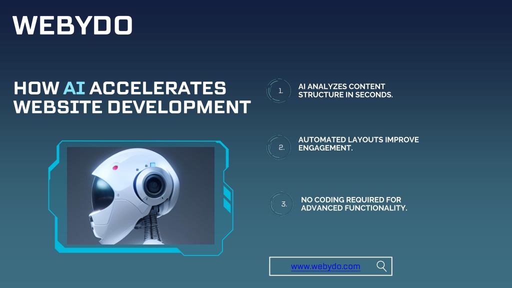 WEBYDO HOW AI ACCELERATES WEBSITE DEVELOPMENT AI ANALYZES CONTENT STRUCTURE IN SECONDS. 1. AUTOMATED LAYOUTS IMPROVE ENGAGEMENT. 2. NO CODING REQUIRED FOR ADVANCED FUNCTIONALITY. 3. www.webydo.com